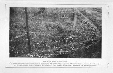 | Keywords: FMIB 47714 Vue d'un Parc a Escargots.jpeg check categories 16 September 2015 3 Vue d'un Parc a Escargots Ces parcs sont entoures d'un grillage a mailles de 19 millimetres eleve de 40 centimetres au-dessus du sol soutenu par des piquest de bois et recourbe a l'interieur On y met les Escargots a raison de 100 par metre carre Subject Snail farming Tag Mollusks 1911 00 Cite book l'Escargot Elevage et Parcage Lucratifs preparation culinaire et vente Boisseau G ; Lanorville G Paris France Librairie Hachette 1911 Plate 3 Creator G Boisseau Creator Georges Lanorville PD-UWASH-FMIB Institution University of Washington FMIB-source accession number 47714 Images from the Freshwater and Marine Image Bank to check G Boisseau Georges Lanorville Mollusca |