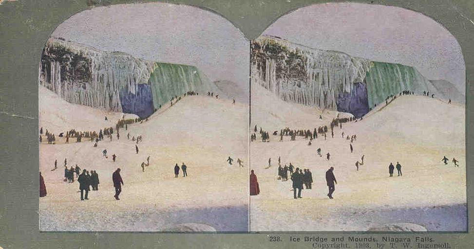 Keywords: FMIB 47746 Ice Bridge and Mounds, Niagara Falls.jpeg check categories 19 September 2015 1 Ice Bridge and Mounds Niagara Falls The grandeur and loveliness of the Niagara Falls is replaced in winter by a not less majestic but more forbidding aspect The mighty sweep of the waters does not allow of any formation of ice in the rapids above or below the falls but at the edges of the river in the shallows mighty columns and pillars of crystal are piled up in the shape of huge mounds on which the snows of heaven descend to add their pure white to the glistening green of the rushing waters the deep purple of the ice behind the flowing cutain and the brilliant hues of the giant icicles reflecting the rays of the sun And however long a visitor may linger new beauties will present themselves and the greater will be his appreciation with every moment Subject Niagara Falls NY and Ont Waterfalls--New York State Waterfalls--Ontario Geographic Subject United States--New York State --Niagara Falls Canada--Ontario--Niagara Falls Tag Limnology 1903 00 Cite book T W Ingersoll 1903 No 238 A8523 Truman Ward Ingersoll PD-UWASH-FMIB Institution University of Washington FMIB-source accession number 47746 Images from the Freshwater and Marine Image Bank to check Niagara Falls Stereographs |