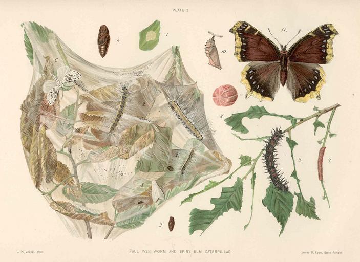 | Keywords: FMIB 47897 Fall Web Worm and Spiny Elm Caterpillar- FAll Web Worm (Hyphantria cunea Drury)- 1 Cluster of eggs; 2 Dorsal views of full and.jpeg check categories 17 September 2015 2 Fall Web Worm and Spiny Elm Caterpillar FAll Web Worm Hyphantria cunea Drury 1 Cluster of eggs; 2 Dorsal views of full and partly grown larvae and also a lateral view of a full grown caterpillar; 3 Pupa; 4 Pupa; 5 White form of moth in resting position; 6 Spotted form of moth with wings expanded Examples 2 5 and 6 are on a small web showing within the partly skeletonized discolored leaves and the frass or excrement of the caterpillars Spiny Elm Caterpillar Euvanessa antiopa Linn 7 Cluster of eggs on a leaf stem; 8 One egg; 9 Caterpillar feeding; 10 Chrysalis hanging from a leaf stem; 11 Butterfly with wings spread natural size The figues of the egg and caterpillar are on a twig of elm representing the characteristic work of the caterpillar Subject Hyphantria cunea Caterpillars Euvanessa Insect pests Tag Insects 1900 00 Cite book Fifth Annual Report of the Commissioners of Fisheries Game and Forests of the State of New York 1899 New York State Commissioners of Fisheries Game and Forests Albany NY James B Lyon State Printer 1900 Facing page 374 L H Joulet PD-UWASH-FMIB Institution University of Washington FMIB-source accession number 47897 Images from the Freshwater and Marine Image Bank to check Hyphantria cunea Caterpillars |