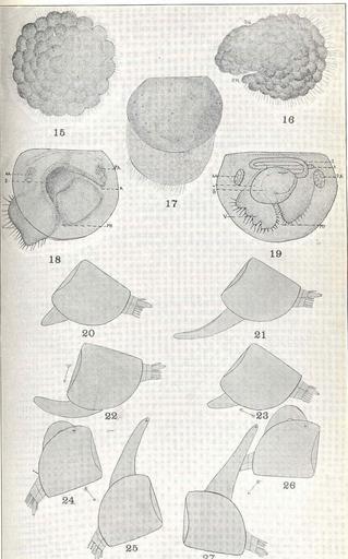 Keywords: FMIB 48193 -Quahog Eggs- -.jpeg check categories 17 September 2015 2 Quahog Eggs Fig 15 --Ciliated gastrula ten hours after fecundation The embryo Can now swim through the water by means of hairlike cilia The larger cells have become invaginated Fig 16 --Trochosphere stage twelve to fourteen hours after fecundation The body has elongated and the cilia are now confined to the front end The opening of the primitive mouth pm cn be seen on the lower side while above is a slight indentation corresponding to the eginning of the shell gland sg Fig 17 --Formation of the shell which arises at two symmetrical points of calcification right and left of the median line and gradually envelops the animal Fig 18 --Early veliger swimmer with velum extended from the shell about thirty-six hours after fecundation aa anterior adductor muscle pa posterior adductor muscle s stomach a anus mt mouth v velum Fig 19 --Veliger slightly older than shown in Fig 18 The intesting i has elongated and the liver l is more prominent Subject Northern quahog--Eggs Northern quahog--reproduction Northern quahog--Locomotion Tag Shellfish 1912 Cite book Report Upon the Quahaug and Oyster Fisheries of Massachusetts Massachusetts Commissioners on Fisheries and Game Boston MA Wright Potter Printing Co 1912 Fig 15-27 State of Massachusetts Fish and Game Commission PD-UWASH-FMIB Institution University of Washington FMIB-source accession number 48193 Images from the Freshwater and Marine Image Bank to check State of Massachusetts Fish and Game Commission Shellfish |