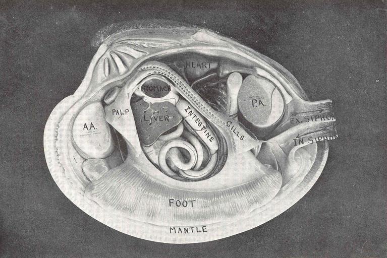 Keywords: FMIB 48201 -Quahog--.jpeg check categories 17 September 2015 2 Quahog Photograph taken from a model in the Museum of Natural History in New York The different portions of the anatomy are indicated by the labels The sympol A A and P A refer to the anterior and posterior adductor muscles which hold the two valves of the shell together The posterior part of the animal is represented by the siphon which consists of two parts an incurrent and an excurrent through which the water enters and leaves the quahaug in the directions indicated by the arrows In the mantle chamber the food is filtered from the water by the gills which are here shown cut off near their base Subject Northern quahog--Anatomy Tag Shellfish 1912 Cite book Report Upon the Quahaug and Oyster Fisheries of Massachusetts Massachusetts Commissioners on Fisheries and Game Boston MA Wright Potter Printing Co 1912 Fig 47 State of Massachusetts Fish and Game Commission PD-UWASH-FMIB Institution University of Washington FMIB-source accession number 48201 Images from the Freshwater and Marine Image Bank to check State of Massachusetts Fish and Game Commission Shellfish |