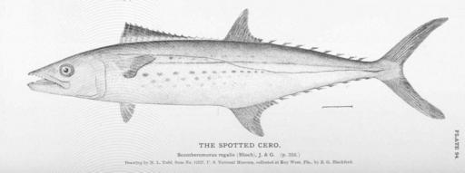 | Keywords: FMIB 50949 Spotted Cero.jpeg Spotted Cero Subject Scomberomorus Tag Fish 1884 Cite book Fisheries and Fishery Industries of the United States Section I Natural History of Useful Aquatic Animals Plates Goode George Brown Washington DC Government Printing Office 1884 Plate 94 Creator H L Todd PD-UWASH-FMIB Institution University of Washington FMIB-source accession number 50949 Images from the Freshwater and Marine Image Bank to check H L Todd Scomberomorus regalis | ||||