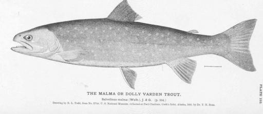 | Keywords: FMIB 51079 Malma or Dolly Varden Trout.jpeg Malma or Dolly Varden Trout Salvelinus malma Walb J G Subject Dolly Varden Fish Tag Fish 1884 Cite book Fisheries and Fishery Industries of the United States Section I Natural History of Useful Aquatic Animals Plates Goode George Brown Washington DC Government Printing Office 1884 Plate 193 Creator George Brown Goode PD-UWASH-FMIB Institution University of Washington FMIB-source accession number 51079 Images from the Freshwater and Marine Image Bank to check The Fisheries and Fishery Industries of the United States Salvelinus malma |