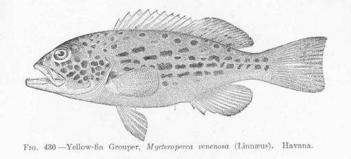| Keywords: FMIB 52002 Yellow-fin Grouper, Mycterioperca venenosa (Linnaeus) Havana.jpeg Yellow-fin Grouper Mycterioperca venenosa Linnaeus Havana Subject Groupers Mycteroperca Tag Fish 1907 Cite book Fishes Jordan David Starr New York City NY Henry Holt and Company 1907 Fig 430 Creator David Starr Jordan PD-UWASH-FMIB Institution University of Washington FMIB-source accession number 52002 Images from the Freshwater and Marine Image Bank to check David Starr Jordan Mycteroperca venenosa | ||||