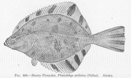 | Keywords: FMIB 52177 Starry Flounder, Platichthys stellatus (Pallas) Alaska.jpeg Starry Flounder Platichthys stellatus Pallas Alaska Subject Starry flounder Flatfishes Tag Fish 1907 Cite book Fishes Jordan David Starr New York City NY Henry Holt and Company 1907 Fig 608 Creator David Starr Jordan PD-UWASH-FMIB Institution University of Washington FMIB-source accession number 52177 Images from the Freshwater and Marine Image Bank to check David Starr Jordan Platichthys stellatus | ||||