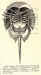 | Keywords: FMIB 52709 Under surface of horseshoe-crab, Limulus polyphemus -.jpeg check categories 11 September 2015 3 Under surface of horseshoe-crab Limulus polyphemus a abdomen; c cephalothorax; g the first gill-bearing abdominal appendage; m mouth; o operculum; p telson; s metasfoma; 1-6 cephalothoracic limbs Subject Limulus polyphemus Tag Shellfish 1903 Cite book Sea-Beach at Ebb-Tide Arnold Augusta Foote New York Century Co 1903 295 Creator Augusta Foote Arnold PD-UWASH-FMIB Institution University of Washington FMIB-source accession number 52709 Images from the Freshwater and Marine Image Bank to check Augusta Foote Arnold Limulus polyphemus Shellfish |