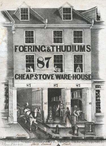 Keywords: library company of philadelphia librarycompanyofphiladelphia lithography (philadelphia, pa.) lithographyphiladelphiapa philadelphia on stone philadelphiaonstone advertisements (philadelphia, pa.) advertisementsphiladelphiapa stores & shops (philadelphia, pa.) storesshopsphiladelphiapa clerks (retail trade), (philadelphia, pa.) clerksretailtradephiladelphiapa merchandise displays (philadelphia, pa.) merchandisedisplaysphiladelphiapa building architecture Advertisement depicting the three-and-a-half story warehouse operated by Frederick Foering and C.A. Thudium at 87 North Second Street. In the open entranceways, a clerk assists a female shopper and an African American laborer lifts a stove. Displays of stoves line the sidewalk and the store walls. On the second floor near open windows, white laborers work. A horse-drawn cart departs an adjoining exitway. Foering and Thudium, one of the city's first domestic stove manufacturers, started in business in 1828, and operated on North Second Street from 1845 until 1847. Advertisement depicting the three-and-a-half story warehouse operated by Frederick Foering and C.A. Thudium at 87 North Second Street. In the open entranceways, a clerk assists a female shopper and an African American laborer lifts a stove. Displays of stoves line the sidewalk and the store walls. On the second floor near open windows, white laborers work. A horse-drawn cart departs an adjoining exitway. Foering and Thudium, one of the city's first domestic stove manufacturers, started in business in 1828, and operated on North Second Street from 1845 until 1847.