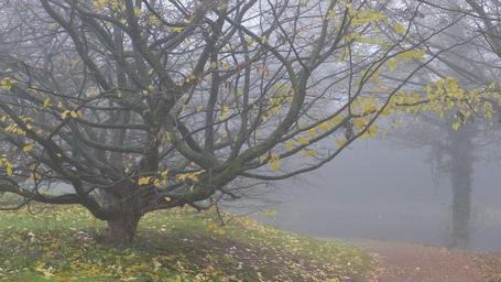 Keywords: fog autumn november leaf fall atmosphere branches mood