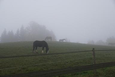 Keywords: fog meadow horse pasture field grass switzerland neuchatel landscape forest animal brown weather autumn summer