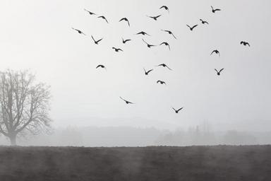 Keywords: fog mood landscape fog bank fog day november arable plowed steam tree pigeons swarm flying