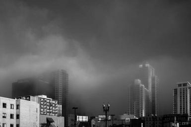 Keywords: foggy cloudy clouds skyline city black and white architecture