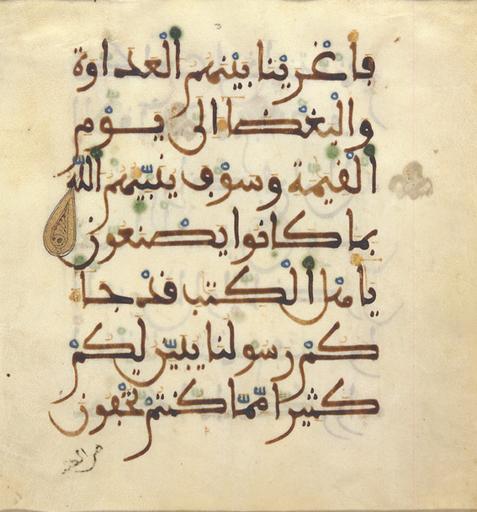 | Keywords: Folio from a Koran (13th century).jpg  Folio from a Koran Surat Al Ma'ida written in Maghrebi script Ink opaque watercolor and gold on parchment H 16 6 W 15 6 cm North Africa http //www asia si edu/collections/zoom/F1929 68 jpg century 13 form North Africa PD-Old Arabic calligraphy styles |