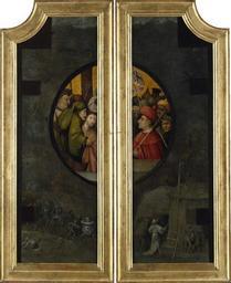 | Keywords: Follower of Hieronymus Bosch - Adoration of the Magi - Upton House (closed).jpg follower of LangSwitch Hieronymus Jheronimus Bosch Christ before Pilate after the Flagellation surrounded by scenes with flying demons and a procession of fantastic figures Exterior of a triptych depicting the Adoration of the Magi See File Follower of Hieronymus Bosch - Adoration of the Magi - Upton House open jpg for the interior ~ 1495-1520 oil oak panel cm 91 4 72 9 Institution Upton House Banbury Object history by 1854 Henry Danby Seymour 1820-1877 London ProvenanceEvent 1936-01-17 sale Robert Langton Douglas -1951 Miss Seymour Knight Frank Rutley London ProvenanceEvent 1936 acquisition Vitale Bloch art dealer London ~ 1937 acquisition Walter Samuel 2nd Viscount Bearsted -1948 London /Upton House ProvenanceEvent 1948 gift LangSwitch die the au de National Trust 56479 Follower of LangSwitch Hieronymus Jheronimus Bosch Christus voor Pilatus omgeven door voorstellingen uit de hel late Other date century 15 / early Other date century 16 1480-1520 cm 91 4 72 9 Exhibition history The Bearsted Collection from Upton House Banbury 35-36 75 www nationaltrustcollections org uk http //www nationaltrustcollections org uk/ Home http //www nationaltrustcollections org uk/object/446744 Info 143 Other versions Greyscale version somewhat higher resolution File Jheronimus Bosch copyist 001 exterior 01 jpg PD-old-100 Paintings by Hieronymus Bosch Christ Before Pilate Uploaded with UploadWizard Upton House Art collection Bosch Hieronymus Closed triptychs |