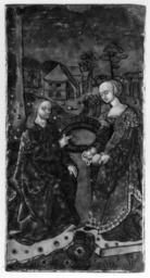 | Keywords: Follower of the Master of the Louis XII Triptych - Christ and the Woman of Samaria - Walters 4490.jpg The scene represented is that narrated by St John at the fourth chapter of his Gospel verse seven There cometh a woman of Samaria to draw water Jesus saith to her 'Give me a drink ' Christ seated on a rocky ledge on the left facing three-quarters to the right wears a long purple robe highlighted with gilding a short beard and long hair His bare feet rest on a slab of stone The woman of Samaria wears a brocaded mulberry-brown overdress with short sleeves having puffed and jeweled edges The long sleeves of the blue under-dress hang wide at the wrists Her forehead is shaven and her hair caught in a tight-fitting cap She stands on a square plinth near the central wall pouring water from a small jug into a pitcher on the ground On the left is a tree In the distant background to the left appears Christ distinguished by his radiant halo with a group of five disciples approaching the scene while in the central background there are three other disciples Between the two groups there are two barns or hovels quite German in style and on the right the fortified wall of Samaria The sky streaked with tiny elongated gilt clouds is painted in two colors turquoise above the horizon deep blue towards the zenith The style resembles that of the manuscript illuminator Jean Bourdichon The facial characteristics connect it with the manner of the Master of the Louis XII Triptych Various details demonstrate an increasing influence of the technique of engraving between 1510 1520 Renaissance painted translucent enamels on copper cm 21 10 7 accession number 44 90 38390 Valerio Collection Sale Paris December 18 1893 no 76 Jacques Seligmann Paris date and mode of acquisition unknown William T / Henry Walters Collection Baltimore date of acquisition unknown by purchase Walters Art Museum Henry Walters Acquired by William T or Henry Walters place of origin Limoges France Walters Art Museum license 2D Renaissance applied arts in the Walters Art Museum Media contributed by the Walters Art Museum needs category review Media contributed by the Walters Art Museum needs artist review Samaritan woman at the well |
