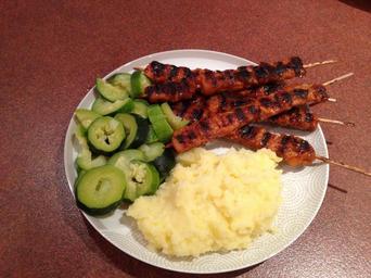 Keywords: food chicken mash potatoes cucumbers chicken on stick plate dinner meal meat grilled