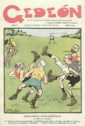 | Keywords: Foot-ball diplomático, de Joaquín Xaudaró.jpg Portada del 17 de junio de 1904 de la revista satírica española Gedeón Foot-ball diplomático 1904 6 17 Gedeón Foot-ball diplomático 447 1 http //hemerotecadigital bne es/issue vm id 0003065326 page 1 date 1904 6 17 Creator Joaquín Xaudaró PD-Scan PD-old-auto-1923 1933 Caricatures by Joaquín Xaudaró in Gedeón 1904 in Spain Francisco Silvela caricatures Antoni Maura caricatures Count of Romanones caricatures Juan Manuel Sánchez y Gutiérrez de Castro Fernando León y Castillo caricatures Political cartoons of Spain |