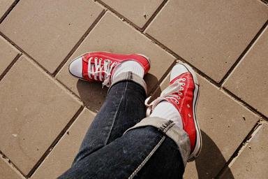 Keywords: foot crossed legs shoe sneakers body body part pose people person female pavement sitting jeans fashion feet legs