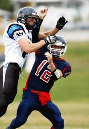 Keywords: football american football quarterback tackle defender hit aggressive passer competition collision football game sport game play gridiron attacker canadian canada