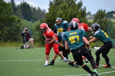 Keywords: football american football helmet red jerseys contact game sport fun charge win determination players rules field play-off position placement cooperation toil courage