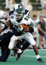 Keywords: football running back ball carrier tackle power running gridiron male sport ball headgear american football player player back competition helmet play green action