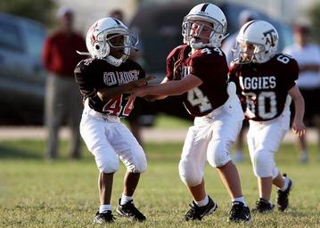 Keywords: football youth league competition blocking players game diversity field interaction multiethnic sport team helmet uniform american texas grass young action activity competing