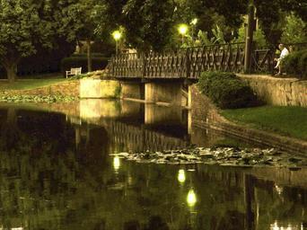 Keywords: footbridge night dusk stream creek water bridge lampposts bench twilight reflection urban
