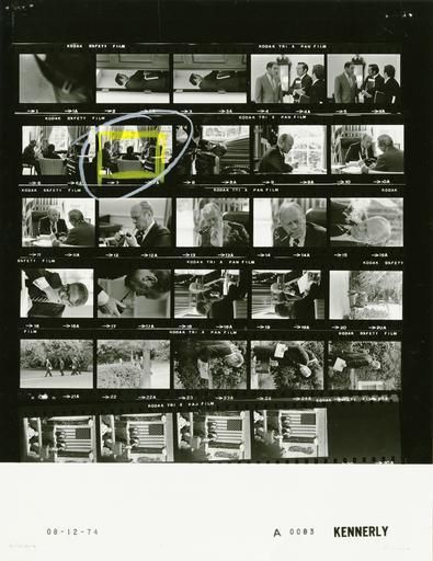 Keywords: Ford A0083 NLGRF photo contact sheet (1974-08-12)(Gerald Ford Library).jpg White House Photographic Office WHPO is housed at the Gerald R Ford Presidential Library a branch of the National Archives and Records Administration NARA <br/><br/> This file is a 200 dpi photo contact sheet having images from roll of film A0083 of the August 9 1974 - January 20 1977 Gerald R Ford White House Photographic Office Series A0001-A9999 and B0001-B2886 photographs <br/><br/> The date on the photo contact sheet is the date the roll of film was processed not necessarily the date the photographs were taken See table below for additional details 1974-08-12 Gerald R Ford Presidential Library Image http //www fordlibrarymuseum gov/library/whphotos/A0083_NLGRF jpg A0083_NLGRF jpg from http //www fordlibrarymuseum gov/library/whphotos/19740812whpo pdf White House Photographs August 12 1974 of the http //www fordlibrarymuseum gov/Library/whphotos/whpo asp White House Photographic Collection page White House Photographic Office WHPO <br/> Creator David Hume Kennerly PD-USGov Institution Institution Gerald R Ford Presidential Library Table wikitable sortable + Photo contact sheet A0083 U S President Ford Administration Gerald R Ford Library Frame s Tone Subject proper Subject generic Names Geographic Location Photographer Date - 1 BW Kennerly 1974-08-12 - 2-3 BW standing in doorway Rumsfeld White House Kennerly 1974-08-12 - 4-5 BW standing talking Rumsfeld Haig terHorst Outside Oval Office Kennerly 1974-08-12 - 6-7 BW meeting seated around desk GRF Hartmann terHorst Oval Office Kennerly 1974-08-12 - 8-9 BW listening seated at desk GRF Oval Office Kennerly 1974-08-12 - 10-11 BW talking seated at desk GRF Hartmann Oval Office Kennerly 1974-08-12 - 12-15 BW smoking pipe seated at desk GRF Oval Office Kennerly 1974-08-12 - 16 BW hand on face Kissinger Oval Office Kennerly 1974-08-12 - 17 BW smoking pipe GRF Oval Office Kennerly 1974-08-12 - 18-19 BW talking seated at desk GRF Kissinger Oval Office Kennerly 1974-08-12 - 20-22 BW GRF South Lawn Kennerly 1974-08-12 - 23-25 BW 514 Crown View Drive - Alexandria Virginia standing on front walk GRF Alexandria VA Ford Home Kennerly 1974-08-12 - 26-29 BW Address before a Joint Session of Congress making speech GRF Speaker Carl Albert President Pro tem James Eastland House Clerks Capitol Building House Chamber Kennerly 1974-08-12 Gerald R Ford Presidential Library and Museum-cooperation PD-USGov Contact sheets by the Ford White House August 1974 Photographs by David Hume Kennerly from 1974 |