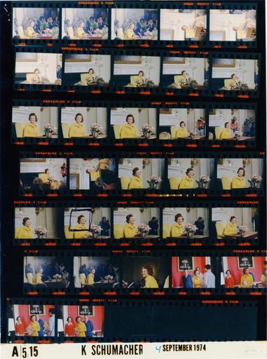 | Keywords: Ford A0515 NLGRF photo contact sheet (1974-09-04)(Gerald Ford Library).jpg White House Photographic Office WHPO is housed at the Gerald R Ford Presidential Library a branch of the National Archives and Records Administration NARA <br/><br/> This file is a 200 dpi photo contact sheet having images from roll of film A0515 of the August 9 1974 - January 20 1977 Gerald R Ford White House Photographic Office Series A0001-A9999 and B0001-B2886 photographs <br/><br/> The date on the photo contact sheet is the date the roll of film was processed not necessarily the date the photographs were taken See table below for additional details 1974-09-04 Gerald R Ford Presidential Library Image http //www fordlibrarymuseum gov/library/whphotos/A0515_NLGRF jpg A0515_NLGRF jpg from http //www fordlibrarymuseum gov/library/whphotos/19740904whpo pdf White House Photographs September 4 1974 of the http //www fordlibrarymuseum gov/Library/whphotos/whpo asp White House Photographic Collection page White House Photographic Office WHPO - Schumacher PD-USGov Institution Institution Gerald R Ford Presidential Library Table wikitable sortable + Photo contact sheet A0515 U S President Ford Administration Gerald R Ford Library Frame s Tone Subject proper Subject generic Names Geographic Location Photographer Date - 3-5 Color First Lady's First Press Conference seated at table - stage right close shot Betty Ford Media State Dining Room Schumacher 1974-09-04 - 6-12 Color First Lady's First Press Conference seated at table - right center close shot Betty Ford Media State Dining Room Schumacher 1974-09-04 - 13-15 Color First Lady's First Press Conference seated at table - right center waist up Betty Ford State Dining Room Schumacher 1974-09-04 - 16-19 Color First Lady's First Press Conference seated at table - right center close shot Betty Ford State Dining Room Schumacher 1974-09-04 - 20-27 Color First Lady's First Press Conference seated at table - right center waist up Betty Ford State Dining Room Schumacher 1974-09-04 - 28-29 Color First Lady's First Press Conference seated at table - medium shot stage right Betty Ford State Dining Room Schumacher 1974-09-04 - 30 Color First Lady's First Press Conference seated - head and shoulders stage left Betty Ford State Dining Room Schumacher 1974-09-04 - 31-34 Color Reception after First Lady's Press Conference posing handshaking smiling Betty Ford Unidentified Man woman Red Room Schumacher 1974-09-04 Gerald R Ford Presidential Library and Museum-cooperation PD-USGov Contact sheets by the Ford White House September 1974 |