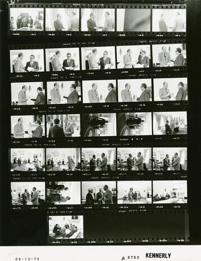 Keywords: Ford A0752 NLGRF photo contact sheet (1974-09-13)(Gerald Ford Library).jpg White House Photographic Office WHPO is housed at the Gerald R Ford Presidential Library a branch of the National Archives and Records Administration NARA <br/><br/> This file is a 200 dpi photo contact sheet having images from roll of film A0752 of the August 9 1974 - January 20 1977 Gerald R Ford White House Photographic Office Series A0001-A9999 and B0001-B2886 photographs <br/><br/> The date on the photo contact sheet is the date the roll of film was processed not necessarily the date the photographs were taken See table below for additional details 1974-09-13 Gerald R Ford Presidential Library Image http //www fordlibrarymuseum gov/library/whphotos/A0752_NLGRF jpg A0752_NLGRF jpg from http //www fordlibrarymuseum gov/library/whphotos/19740913whpo pdf White House Photographs September 13 1974 of the http //www fordlibrarymuseum gov/Library/whphotos/whpo asp White House Photographic Collection page White House Photographic Office WHPO <br/> Creator David Hume Kennerly PD-USGov Institution Institution Gerald R Ford Presidential Library Table wikitable sortable + Photo contact sheet A0752 U S President Ford Administration Gerald R Ford Library Frame s Tone Subject proper Subject generic Names Geographic Location Photographer Date - 3 BW Prime Minister of Israel; Israeli Ambassador to the United States standing talking Kissinger Yitzhak Rabin Ambassador Simcha Dinitz Others Cabinet Room Kennerly 1974-09-13 - 4-5 BW standing talking; GRF with hands in pockets - waist up GRF Kissinger Oval Office Kennerly 1974-09-13 - 6 BW Kennerly 1974-09-13 - 7 BW standing talking; GRF with hands in pockets - waist up GRF Kissinger Oval Office Kennerly 1974-09-13 - 8-18 BW standing talking - waist up facing camera GRF Kissinger Oval Office Kennerly 1974-09-13 - 19 BW standing talking - waist up HAK's back to camera GRF Kissinger Oval Office Kennerly 1974-09-13 - 20-21 BW standing talking - long shot HAK's back to camera GRF Kissinger Oval Office Kennerly 1974-09-13 - 22 BW standing laughing - long shot facing camera GRF Kissinger Oval Office Kennerly 1974-09-13 - 23 BW GRF and HAK seated; Scowcroft standing showing HAK document GRF Kissinger Scowcroft Oval Office Kennerly 1974-09-13 - 24 BW GRF and Scowcroft standing; HAK seated reading document GRF Kissinger Scowcroft Oval Office Kennerly 1974-09-13 - 25-29 BW Prime Minister of Israeli standing talking; HAK and Scowcroft talking in background Scowcroft standing HAK sitting in frames 25 and 26 standing in others GRF Yitzhak Rabin Kissinger Scowcroft Oval Office Kennerly 1974-09-13 - 30-31 BW Prime Minister of Israeli greeting handshaking GRF Ambassador Dinitz Ambassador Keating Others Oval Office Kennerly 1974-09-13 - 32-33 BW Prime Minister of Israeli seated near fireplace talking; all not appearing in every frame GRF Yitzhak Rabin Ambassador Dinitz Ambassador Keating Kissinger Scowcroft Oval Office Kennerly 1974-09-13 Gerald R Ford Presidential Library and Museum-cooperation PD-USGov Contact sheets by the Ford White House September 1974 Photographs by David Hume Kennerly from 1974 |