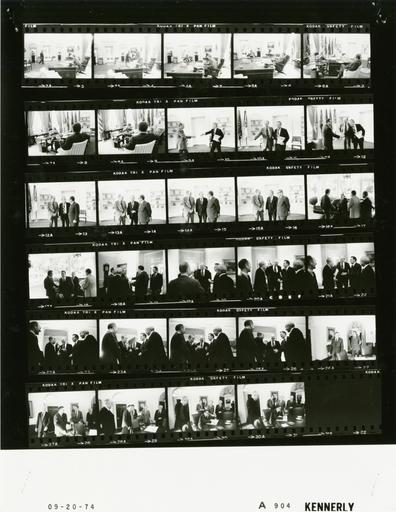 | Keywords: Ford A0904 NLGRF photo contact sheet (1974-09-20)(Gerald Ford Library).jpg White House Photographic Office WHPO is housed at the Gerald R Ford Presidential Library a branch of the National Archives and Records Administration NARA <br/><br/> This file is a 200 dpi photo contact sheet having images from roll of film A0904 of the August 9 1974 - January 20 1977 Gerald R Ford White House Photographic Office Series A0001-A9999 and B0001-B2886 photographs <br/><br/> The date on the photo contact sheet is the date the roll of film was processed not necessarily the date the photographs were taken See table below for additional details 1974-09-20 Gerald R Ford Presidential Library Image http //www fordlibrarymuseum gov/library/whphotos/A0904_NLGRF jpg A0904_NLGRF jpg from http //www fordlibrarymuseum gov/library/whphotos/19740920whpo pdf White House Photographs September 20 1974 of the http //www fordlibrarymuseum gov/Library/whphotos/whpo asp White House Photographic Collection page White House Photographic Office WHPO <br/> Creator David Hume Kennerly PD-USGov Institution Institution Gerald R Ford Presidential Library Table wikitable sortable + Photo contact sheet A0904 U S President Ford Administration Gerald R Ford Library Frame s Tone Subject proper Subject generic Names Geographic Location Photographer Date - 2A BW GRF seated at desk Kissinger walking GRF Kissinger Oval Office Kennerly 1974-09-20 - 3A BW standing greeting handshaking GRF Kissinger Oval Office Kennerly 1974-09-20 - 4A-6A BW seated around desk talking GRF Kissinger Oval Office Kennerly 1974-09-20 - 7A-8A BW seated around desk talking; camera behind HAK GRF Kissinger Oval Office Kennerly 1974-09-20 - 9A-10A BW United States Senator WA Washington greeting handshaking GRF Sen Jackson Oval Office Kennerly 1974-09-20 - 11A BW United States Senator WA Washington greeting handshaking GRF Sen Jackson Kissinger Oval Office Kennerly 1974-09-20 - 12A-15A BW United States Senator WA Washington standing talking GRF Sen Jackson Kissinger Oval Office Kennerly 1974-09-20 - 16A-17A BW Soviet Foreign Minister; Ambassador of Union of Soviet Socialist Republics USSR to United States Dobrynin Gromyko and Sukhrodev exiting limousine Ambassador Catto Andrei Gromyko Ambassador Anatoly Dobrynin Victor Sukhrodev Secret Service North Portico Kennerly 1974-09-20 - 18A-25A BW Soviet Foreign Minister; Ambassador of Union of Soviet Socialist Republics USSR to United States greeting handshaking all not in every frame Ambassador Stoessel Andrei Gromyko Ambassador Anatoly Dobrynin Victor Sukhrodev Sen Jackson Scowcroft Cabinet Room Kennerly 1974-09-20 - 26A BW Soviet Foreign Minister; Chief of Protocol walking around table Ambassador Catto Andrei Gromyko Cabinet Room Kennerly 1974-09-20 - 27A-28A BW Soviet Foreign Minister; Ambassador of Union of Soviet Socialist Republics USSR to United States talking laughing Ambassador Stoessel Andrei Gromyko Ambassador Anatoly Dobrynin Victor Sukhrodev Scowcroft Cabinet Room Kennerly 1974-09-20 - 29A-30A BW Soviet Foreign Minister; Ambassador of Union of Soviet Socialist Republics USSR to United States Gromyko seated writing; others standing looking down Ambassador Stoessel Andrei Gromyko Ambassador Anatoly Dobrynin Victor Sukhrodev Scowcroft Cabinet Room Kennerly 1974-09-20 Gerald R Ford Presidential Library and Museum-cooperation PD-USGov Contact sheets by the Ford White House September 1974 Photographs by David Hume Kennerly from 1974 |