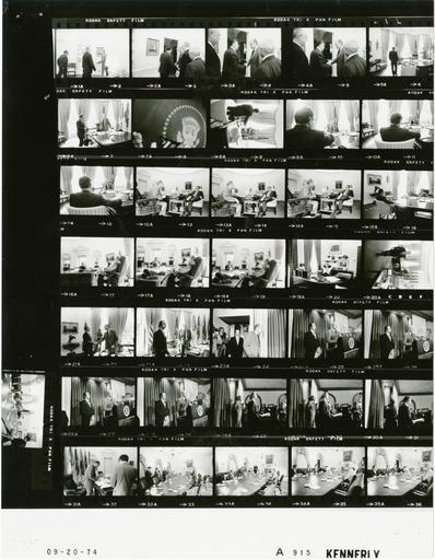 | Keywords: Ford A0915 NLGRF photo contact sheet (1974-09-20)(Gerald Ford Library).jpg White House Photographic Office WHPO is housed at the Gerald R Ford Presidential Library a branch of the National Archives and Records Administration NARA <br/><br/> This file is a 200 dpi photo contact sheet having images from roll of film A0915 of the August 9 1974 - January 20 1977 Gerald R Ford White House Photographic Office Series A0001-A9999 and B0001-B2886 photographs <br/><br/> The date on the photo contact sheet is the date the roll of film was processed not necessarily the date the photographs were taken See table below for additional details 1974-09-20 Gerald R Ford Presidential Library Image http //www fordlibrarymuseum gov/library/whphotos/A0915_NLGRF jpg A0915_NLGRF jpg from http //www fordlibrarymuseum gov/library/whphotos/19740920whpo pdf White House Photographs September 20 1974 of the http //www fordlibrarymuseum gov/Library/whphotos/whpo asp White House Photographic Collection page White House Photographic Office WHPO <br/> Creator David Hume Kennerly PD-USGov Institution Institution Gerald R Ford Presidential Library Table wikitable sortable + Photo contact sheet A0915 U S President Ford Administration Gerald R Ford Library Frame s Tone Subject proper Subject generic Names Geographic Location Photographer Date - 2 BW Ambassador of Union of Soviet Socialist Republics USSR to United States walking towards door GRF Kissinger Ambassador Anatoly Dobrynin Oval Office Kennerly 1974-09-20 - 3-5 BW Soviet Foreign Minister; Ambassador of Union of Soviet Socialist Republics USSR to United States handshaking near door out of Office GRF Ambassador Stoessel Andrei Gromyko Ambassador Anatoly Dobrynin Oval Office Kennerly 1974-09-20 - 6-7 BW walking towards desk GRF Kissinger Oval Office Kennerly 1974-09-20 - 8 BW Kennerly 1974-09-20 - 9 BW standing near desk GRF Kissinger Oval Office Kennerly 1974-09-20 - 10-12 BW seated talking; HAK's back to camera GRF Kissinger Oval Office Kennerly 1974-09-20 - 13-19 BW seated talking; various angles GRF Kissinger Oval Office Kennerly 1974-09-20 - 20 BW Press Secretary to the President nominee seated; feet on desk hands clasped behind head Nessen Press Secretary's Office Kennerly 1974-09-20 - 21 BW HAK leaving room; GRF standing in background GRF Kissinger Oval Office Kennerly 1974-09-20 - 22 BW Press Secretary to the President nominee greeting handshaking; Thomas photographing in background GRF Nessen Thomas Oval Office Kennerly 1974-09-20 - 23 BW Press Secretary to the President nominee walking towards doorway GRF Nessen Oval Office Kennerly 1974-09-20 - 24 BW Press Secretary to the President nominee walking into room towards stage GRF Nessen White House -Press Briefing Area Kennerly 1974-09-20 - 25-28 BW Introduction of Ron Nessen as Press Secretary to the President GRF speaking from podium; Nessen standing nearby GRF Nessen White House -Press Briefing Area Kennerly 1974-09-20 - 29-31 BW Introduction of Ron Nessen as Press Secretary to the President Nessen speaking from podium; GRF standing nearby GRF Nessen White House -Press Briefing Area Kennerly 1974-09-20 - 32 BW GRF standing reading document smoking pipe GRF O'Donnell Oval Office Kennerly 1974-09-20 - 33-37 BW Discussion of Proposals for Nat Development Bank and a Nat Growth Policy seated around table; all not in every frame GRF David Rockefeller Warren Lindquist Owen Frisby John R Price Lynn Cole Seidman William E Casselman III Cabinet Room Kennerly 1974-09-20 Gerald R Ford Presidential Library and Museum-cooperation PD-USGov Contact sheets by the Ford White House September 1974 Photographs by David Hume Kennerly from 1974 |