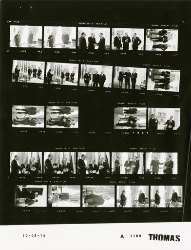 | Keywords: Ford A1160 NLGRF photo contact sheet (1974-10-02)(Gerald Ford Library).jpg White House Photographic Office WHPO is housed at the Gerald R Ford Presidential Library a branch of the National Archives and Records Administration NARA <br/><br/> This file is a 200 dpi photo contact sheet having images from roll of film A1160 of the August 9 1974 - January 20 1977 Gerald R Ford White House Photographic Office Series A0001-A9999 and B0001-B2886 photographs <br/><br/> The date on the photo contact sheet is the date the roll of film was processed not necessarily the date the photographs were taken See table below for additional details 1974-10-02 Gerald R Ford Presidential Library Image http //www fordlibrarymuseum gov/library/whphotos/A1160_NLGRF jpg A1160_NLGRF jpg from http //www fordlibrarymuseum gov/library/whphotos/19741002whpo pdf White House Photographs October 2 1974 of the http //www fordlibrarymuseum gov/Library/whphotos/whpo asp White House Photographic Collection page White House Photographic Office WHPO - Thomas PD-USGov Institution Institution Gerald R Ford Presidential Library Table wikitable sortable + Photo contact sheet A1160 U S President Ford Administration Gerald R Ford Library Frame s Tone Subject proper Subject generic Names Geographic Location Photographer Date - 2A-3A BW Black Star Photographer standing behind desk talking GRF Fred Ward Oval Office Thomas 1974-10-02 - 4A-6A BW Presenting of Senate Petition of Support and Best Wishes for Betty Ford greeting handshaking with Mansfield; standing talking GRF Sens Scott Mansfield Oval Office Thomas 1974-10-02 - 7A-8A BW Black Star Photographer standing talking; Ward shooting photographs GRF Sens Scott Mansfield; Fred Ward Oval Office Thomas 1974-10-02 - 9A-11A BW Presenting of Senate Petition of Support and Best Wishes for Betty Ford standing holding petition GRF Sens Scott Mansfield Oval Office Thomas 1974-10-02 - 16A-18A BW Presenting gifts to GRF standing talking; Mansfield holding can of pipe tobacco GRF Sens Scott Mansfield Oval Office Thomas 1974-10-02 - 19A BW Thomas 1974-10-02 - 12A-15A BW Presenting gifts to GRF standing talking; Mansfield holding can of pipe tobacco; Scott holding box GRF Sens Scott Mansfield Oval Office Thomas 1974-10-02 - 22A BW Deputy Assistants for Legislative Affairs standing by interior door of Oval Office GRF Timmons Korologos Oval Office Thomas 1974-10-02 - 23A-24A BW Senate Petition of Support and Best Wishes for Betty Ford standing near desk; holding petition GRF Oval Office Thomas 1974-10-02 - 25A-26A BW Black Star Photographer standing talking near desk GRF Fred Ward Oval Office Thomas 1974-10-02 - 20A-21A BW Presenting gifts to GRF standing talking; Mansfield holding can of pipe tobacco GRF Sens Scott Mansfield Oval Office Thomas 1974-10-02 Gerald R Ford Presidential Library and Museum-cooperation PD-USGov Contact sheets by the Ford White House October 1974 |