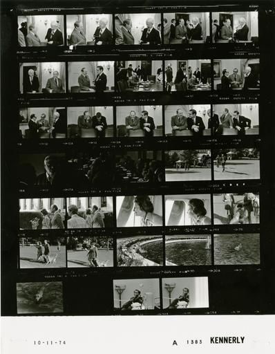 Keywords: Ford A1383 NLGRF photo contact sheet (1974-10-11)(Gerald Ford Library).jpg White House Photographic Office WHPO is housed at the Gerald R Ford Presidential Library a branch of the National Archives and Records Administration NARA <br/><br/> This file is a 200 dpi photo contact sheet having images from roll of film A1383 of the August 9 1974 - January 20 1977 Gerald R Ford White House Photographic Office Series A0001-A9999 and B0001-B2886 photographs <br/><br/> The date on the photo contact sheet is the date the roll of film was processed not necessarily the date the photographs were taken See table below for additional details 1974-10-11 Gerald R Ford Presidential Library Image http //www fordlibrarymuseum gov/library/whphotos/A1383_NLGRF jpg A1383_NLGRF jpg from http //www fordlibrarymuseum gov/library/whphotos/19741011whpo pdf White House Photographs October 11 1974 of the http //www fordlibrarymuseum gov/Library/whphotos/whpo asp White House Photographic Collection page White House Photographic Office WHPO <br/> Creator David Hume Kennerly PD-USGov Institution Institution Gerald R Ford Presidential Library Table wikitable sortable + Photo contact sheet A1383 U S President Ford Administration Gerald R Ford Library Frame s Tone Subject proper Subject generic Names Geographic Location Photographer Date - 2-7 BW Attorney General - Prior to the Cabinet Meeting standing talking - Buchen smoking pipe Saxbe Buchen Cabinet Room Kennerly 1974-10-11 - 8 BW Attorney General - Prior to the Cabinet Meeting standing talking near table Saxbe Sec Simon Cabinet Room Kennerly 1974-10-11 - 9-10 BW Sec of Transportation; Sec of Commerce - Prior to the Cabinet Meeting Brinegar seated Dent standing nearby; others in background Secs Brinegar Dent; Scowcroft Rumsfeld Others Cabinet Room Kennerly 1974-10-11 - 11-12 BW Attorney General - Prior to the Cabinet Meeting standing talking near table Saxbe Buchen Burch Cabinet Room Kennerly 1974-10-11 - 13-16 BW Attorney General - Prior to the Cabinet Meeting standing talking near table; leaning on the backs of chairs Saxbe Sec Simon Cabinet Room Kennerly 1974-10-11 - 17 BW Secretary of the Interior - Prior to the Cabinet Meeting head and shoulders portrait s Sec Morton Cabinet Room Kennerly 1974-10-11 - 18 BW Attorney General - Cabinet Meeting seated at table hand on chin - profile Saxbe Cabinet Room Kennerly 1974-10-11 - 19 BW Cabinet Meeting seated at table - too dark to see faces Saxbe Sec Lynn Ash Others Cabinet Room Kennerly 1974-10-11 - 20-21 BW Prior to helicopter flight to Bethesda Naval Hospital walking towards helicopter ; Guard Shack and Oval Office in background GRF Keiser Others South Lawn Kennerly 1974-10-11 - 22-23 BW Remarks following Mrs Ford's discharge from Bethesda Naval Hospital - Bethesda Maryland standing BF speaking into microphones GRF Betty Ford Secret Service Bethesda MD Sidewalk outside Bethesda Naval Hospital Kennerly 1974-10-11 - 24-25 BW Flight from Bethesda Naval Hospital following Mrs Ford's discharge seated looking out window copter Betty Ford Marine One Kennerly 1974-10-11 - 26 BW Return to White House following Mrs Ford's discharge from Bethesda Naval Hospital Mrs Ford stooping petting dog; others standing heads cut off Betty Ford Liberty Susan Ford GRF South Lawn Kennerly 1974-10-11 - 27-28 BW Return to White House following Mrs Ford's discharge from Bethesda Naval Hospital waving walking toward White House GRF Betty Ford Susan Ford Janet Ford Liberty South Lawn Kennerly 1974-10-11 - 29-32 BW Pet Golden Retriever dog swimming in fountain Liberty South Lawn Fountain Kennerly 1974-10-11 - 33 BW Kennerly 1974-10-11 - 34-35 BW seated in chair holding oxygen mask over mouth Kennerly White House Infirmary Kennerly 1974-10-11 Gerald R Ford Presidential Library and Museum-cooperation PD-USGov Contact sheets by the Ford White House October 1974 Photographs by David Hume Kennerly from 1974 Dogs and fountains Golden Retriever |