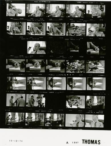 | Keywords: Ford A1397 NLGRF photo contact sheet (1974-10-12)(Gerald Ford Library).jpg White House Photographic Office WHPO is housed at the Gerald R Ford Presidential Library a branch of the National Archives and Records Administration NARA <br/><br/> This file is a 200 dpi photo contact sheet having images from roll of film A1397 of the August 9 1974 - January 20 1977 Gerald R Ford White House Photographic Office Series A0001-A9999 and B0001-B2886 photographs <br/><br/> The date on the photo contact sheet is the date the roll of film was processed not necessarily the date the photographs were taken See table below for additional details 1974-10-12 Gerald R Ford Presidential Library Image http //www fordlibrarymuseum gov/library/whphotos/A1397_NLGRF jpg A1397_NLGRF jpg from http //www fordlibrarymuseum gov/library/whphotos/19741012whpo pdf White House Photographs October 12 1974 of the http //www fordlibrarymuseum gov/Library/whphotos/whpo asp White House Photographic Collection page White House Photographic Office WHPO - Thomas PD-USGov Institution Institution Gerald R Ford Presidential Library Table wikitable sortable + Photo contact sheet A1397 U S President Ford Administration Gerald R Ford Library Frame s Tone Subject proper Subject generic Names Geographic Location Photographer Date - 3-7 BW seated at desk talking GRF Oval Office Thomas 1974-10-12 - 8-10 BW seated at desk talking holding coffee cup GRF Oval Office Thomas 1974-10-12 - 11 BW standing lighting pipe GRF Oval Office Thomas 1974-10-12 - 12 BW seated at desk smoking pipe GRF Oval Office Thomas 1974-10-12 - 13 BW Thomas 1974-10-12 - 14 BW seated at desk smoking pipe GRF Oval Office Thomas 1974-10-12 - 15 BW Thomas 1974-10-12 - 16-20 BW hands only signing book Roudebush Bible GRF Oval Office Thomas 1974-10-12 - 21 BW Swearing in of Administrator of the Veterans Administration standing at microphone talking GRF Rose Garden Thomas 1974-10-12 - 22 BW Following Swearing in of Administrator of the Veterans Administration returning to Oval Office GRF Others Colonnade Thomas 1974-10-12 - 23-27 BW standing behind desk reading documents GRF Oval Office Thomas 1974-10-12 - 28-29 BW Signing Ceremony of National Newspaper Carrier Day Proclamation greeting handshaking -all not in every frame GRF William Merritt Lu Ann Leno Matt Singer Paul Carr Oval Office Thomas 1974-10-12 - 30 BW Thomas 1974-10-12 - 31 BW Signing Ceremony of National Newspaper Carrier Day Proclamation greeting handshaking -all not in every frame GRF William Merritt Lu Ann Leno Matt Singer Paul Carr Oval Office Thomas 1974-10-12 - 32-33 BW GRF seated at desk; others standing on either side GRF O'Donnell Hartmann Oval Office Thomas 1974-10-12 - 34-35 BW seated around desk GRF Hartmann Oval Office Thomas 1974-10-12 - 36-37 BW seated at desk reading smoking pipe; close up GRF Oval Office Thomas 1974-10-12 Gerald R Ford Presidential Library and Museum-cooperation PD-USGov Contact sheets by the Ford White House October 1974 |
