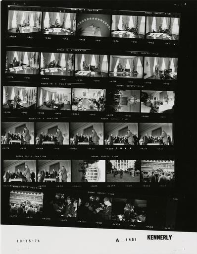 | Keywords: Ford A1431 NLGRF photo contact sheet (1974-10-15)(Gerald Ford Library).jpg White House Photographic Office WHPO is housed at the Gerald R Ford Presidential Library a branch of the National Archives and Records Administration NARA <br/><br/> This file is a 200 dpi photo contact sheet having images from roll of film A1431 of the August 9 1974 - January 20 1977 Gerald R Ford White House Photographic Office Series A0001-A9999 and B0001-B2886 photographs <br/><br/> The date on the photo contact sheet is the date the roll of film was processed not necessarily the date the photographs were taken See table below for additional details 1974-10-15 Gerald R Ford Presidential Library Image http //www fordlibrarymuseum gov/library/whphotos/A1431_NLGRF jpg A1431_NLGRF jpg from http //www fordlibrarymuseum gov/library/whphotos/19741015whpo pdf White House Photographs October 15 1974 of the http //www fordlibrarymuseum gov/Library/whphotos/whpo asp White House Photographic Collection page White House Photographic Office WHPO <br/> Creator David Hume Kennerly PD-USGov Institution Institution Gerald R Ford Presidential Library Table wikitable sortable + Photo contact sheet A1431 U S President Ford Administration Gerald R Ford Library Frame s Tone Subject proper Subject generic Names Geographic Location Photographer Date - 6-7 BW holding hands GRF seated feet on desk talking on phone; Susan standing left hand on chair back GRF Susan Ford Oval Office Kennerly 1974-10-15 - 8 BW GRF seated hanging up phone; Susan standing GRF Susan Ford Oval Office Kennerly 1974-10-15 - 9 BW GRF seated; Susan standing kissing GRF GRF Susan Ford Oval Office Kennerly 1974-10-15 - 10-11 BW GRF seated; Susan standing reading magazine GRF Susan Ford Oval Office Kennerly 1974-10-15 - 12-13 BW GRF seated; Susan walking around desk GRF Susan Ford Oval Office Kennerly 1974-10-15 - 14 BW GRF seated; Susan standing kissing GRF; long shot GRF Susan Ford Oval Office Kennerly 1974-10-15 - 15 BW Meeting with Representatives of the Handicapped and Handicapped People seated around table - all not in every frame GRF Gordon Allen Lorraine Beebe Jane Belau Elizabeth Boggs Betty Catoe Eunice Fiorito Jack Gruenfelder Jewell Hamilton Judd Jacobson Larry Maus Dale Polton Mel Ptacek Max Rheinberger Sr Janice Ryan Robt Sampson James Watson Rolf Williams Cabinet Room Kennerly 1974-10-15 - 16-17 BW Signing Ceremony for S 3044 the Federal Election Campaign Act Amendments of 1974 GRF speaking from podium; others in foreground and background GRF Sens Scott PA Byrd Griffin Mathias; Mary Louise Smith Robert Strauss Reps Rhodes Tip O'Neill McFall Arends Hays Dickinson Frenzel Devine; Others East Room Kennerly 1974-10-15 - 18-22 BW Signing Ceremony for S 3044 the Federal Election Campaign Act Amendments of 1974 GRF seated at table; others standing behind him applauding - all not in every frame GRF Sens Scott PA Byrd Griffin Mathias; Mary Louise Smith Robert Strauss Reps Rhodes Tip O'Neill McFall Arends Hays Dickinson Frenzel Devine; Others East Room Kennerly 1974-10-15 - 23-24 BW Signing Ceremony for S 3044 the Federal Election Campaign Act Amendments of 1974 GRF standing near table; others standing behind him applauding - all not in every frame GRF Sens Scott PA Byrd Griffin Mathias; Mary Louise Smith Robert Strauss Reps Rhodes Tip O'Neill McFall Arends Hays Dickinson Frenzel Devine; Others East Room Kennerly 1974-10-15 - 25-26 BW Keiser and GRF walking staff applauding; South Portico in background GRF Keiser White House Staff South Lawn Kennerly 1974-10-15 - 3-4 BW GRF seated feet on desk talking on phone; Susan standing left hand on chair back right hand GRF Susan Ford Oval Office Kennerly 1974-10-15 - 5 BW Kennerly 1974-10-15 - 27-28 BW Trip to 47th Annual Future Farmers of America Convention FFA -Kansas City Missouri greeting waving - taken from behind GRF GRF Crowd Secret Service Kansas City MO Sidewalk outside the Pioneer Grille Kennerly 1974-10-15 - 29-31 BW Trip to 47th Annual Future Farmers of America Convention FFA -Kansas City Missouri greeting handshaking GRF FFA members Secret Service Kansas City MO Kansas City Municipal Auditorium - Holding Room Kennerly 1974-10-15 Gerald R Ford Presidential Library and Museum-cooperation PD-USGov Contact sheets by the Ford White House October 1974 Photographs by David Hume Kennerly from 1974 |