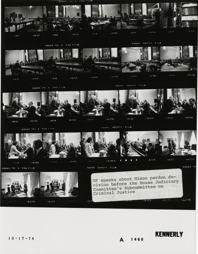 | Keywords: Ford A1468 NLGRF photo contact sheet (1974-10-17)(Gerald Ford Library).jpg White House Photographic Office WHPO is housed at the Gerald R Ford Presidential Library a branch of the National Archives and Records Administration NARA <br/><br/> This file is a 200 dpi photo contact sheet having images from roll of film A1468 of the August 9 1974 - January 20 1977 Gerald R Ford White House Photographic Office Series A0001-A9999 and B0001-B2886 photographs <br/><br/> The date on the photo contact sheet is the date the roll of film was processed not necessarily the date the photographs were taken See table below for additional details 1974-10-17 Gerald R Ford Presidential Library Image http //www fordlibrarymuseum gov/library/whphotos/A1468_NLGRF jpg A1468_NLGRF jpg from http //www fordlibrarymuseum gov/library/whphotos/19741017whpo pdf White House Photographs October 17 1974 of the http //www fordlibrarymuseum gov/Library/whphotos/whpo asp White House Photographic Collection page White House Photographic Office WHPO <br/> Creator David Hume Kennerly PD-USGov Institution Institution Gerald R Ford Presidential Library Table wikitable sortable + Photo contact sheet A1468 U S President Ford Administration Gerald R Ford Library Frame s Tone Subject proper Subject generic Names Geographic Location Photographer Date - 3-12 BW Subcommittee on Criminal Justice - Review of the Pardon of Former President Richard M Nixon Hungate Committee GRF seated at table Congressmen behind desk various angles and distances GRF Reps Hungate Kastenmeier Edwards Mann Holtzman Smith NY Dennis Mayne Hogan; Herbert Hoffman Roger Pauley Audience Washington DC Rayburn House Office Building - Room 2141 House Judiciary Hearing Room Kennerly 1974-10-17 - 13-15 BW Subcommittee on Criminal Justice - Review of the Pardon of Former President Richard M Nixon Hungate Committee standing handshaking after hearings GRF Rep Hungate Washington DC Rayburn House Office Building - Room 2141 House Judiciary Hearing Room Kennerly 1974-10-17 - 16-20 BW Subcommittee on Criminal Justice - Review of the Pardon of Former President Richard M Nixon Hungate Committee standing handshaking after hearings - all not in every frame GRF Reps Hungate Kastenmeier Edwards Mann Holtzman Smith NY Dennis Mayne Hogan; Herbert Hoffman Roger Pauley Audience Washington DC Rayburn House Office Building - Room 2141 House Judiciary Hearing Room Kennerly 1974-10-17 - 21 BW Subcommittee on Criminal Justice - Review of the Pardon of Former President Richard M Nixon Hungate Committee GRF standing near desk; audience in background GRF Audience Washington DC Rayburn House Office Building - Room 2141 House Judiciary Hearing Room Kennerly 1974-10-17 - 22-24 BW standing talking near desk; GRF smoking holding pipe GRF Nessen Marsh Oval Office Kennerly 1974-10-17 Gerald R Ford Presidential Library and Museum-cooperation PD-USGov Contact sheets by the Ford White House October 1974 Photographs by David Hume Kennerly from 1974 |