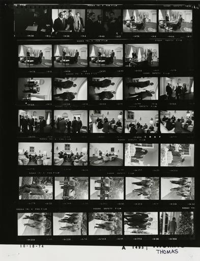 | Keywords: Ford A1493 NLGRF photo contact sheet (1974-10-18)(Gerald Ford Library).jpg White House Photographic Office WHPO is housed at the Gerald R Ford Presidential Library a branch of the National Archives and Records Administration NARA <br/><br/> This file is a 200 dpi photo contact sheet having images from roll of film A1493 of the August 9 1974 - January 20 1977 Gerald R Ford White House Photographic Office Series A0001-A9999 and B0001-B2886 photographs <br/><br/> The date on the photo contact sheet is the date the roll of film was processed not necessarily the date the photographs were taken See table below for additional details 1974-10-18 Gerald R Ford Presidential Library Image http //www fordlibrarymuseum gov/library/whphotos/A1493_NLGRF jpg A1493_NLGRF jpg from http //www fordlibrarymuseum gov/library/whphotos/19741018whpo pdf White House Photographs October 18 1974 of the http //www fordlibrarymuseum gov/Library/whphotos/whpo asp White House Photographic Collection page White House Photographic Office WHPO - Thomas PD-USGov Institution Institution Gerald R Ford Presidential Library Table wikitable sortable + Photo contact sheet A1493 U S President Ford Administration Gerald R Ford Library Frame s Tone Subject proper Subject generic Names Geographic Location Photographer Date - 2A BW President of Portugal leaning over table signing guest book Francisco da Costa Gomes Cabinet Room Thomas 1974-10-18 - 3A-4A BW President of Portugal standing talking Francisco da Costa Gomes Amb Catto Others Cabinet Room Thomas 1974-10-18 - 5A-10A BW standing talking near desk GRF Kissinger Oval Office Thomas 1974-10-18 - 11A BW Thomas 1974-10-18 - 12A-15A BW standing talking near desk GRF Kissinger Oval Office Thomas 1974-10-18 - 16A-18A BW President of Portugal greeting handshaking GRF Francisco da Costa Gomes Kissinger Amb Catto Others Oval Office Thomas 1974-10-18 - 19A-23A BW President; Minister of Foreign Affairs; Ambassador to the United States from Portugal seated talking near fireplace -different angles and distances GRF Francisco da Costa Gomes Mario Alberto Nobre Lopez Joao Hall Themido Kissinger Scowcroft Oval Office Thomas 1974-10-18 - 24A BW President; Minister of Foreign Affairs; Ambassador to the United States from Portugal seated talking near fireplace -Stewards serving coffee GRF Francisco da Costa Gomes Mario Alberto Nobre Lopez Joao Hall Themido Kissinger Scowcroft; White House Stewards Oval Office Thomas 1974-10-18 - 25A-26A BW President of Portugal walking out door of Oval Office GRF Francisco da Costa Gomes Kissinger Colonnade Thomas 1974-10-18 - 27A BW President of Portugal talking walking towards driveway GRF Francisco da Costa Gomes Sidewalk Between Oval Office and South Driveway Thomas 1974-10-18 - 28A-29A BW Departure of the President of Portugal standing waving to limousine; backs to camera GRF Kissinger Sidewalk Between Oval Office and South Driveway Thomas 1974-10-18 - 30A-35A BW Following Departure of the President of Portugal walking talking moving toward Colonnade and camera GRF Kissinger Sidewalk Between Oval Office and South Driveway Thomas 1974-10-18 - 36A BW Following Departure of the President of Portugal entering Oval Office Kissinger Colonnade Thomas 1974-10-18 Gerald R Ford Presidential Library and Museum-cooperation PD-USGov Contact sheets by the Ford White House October 1974 |