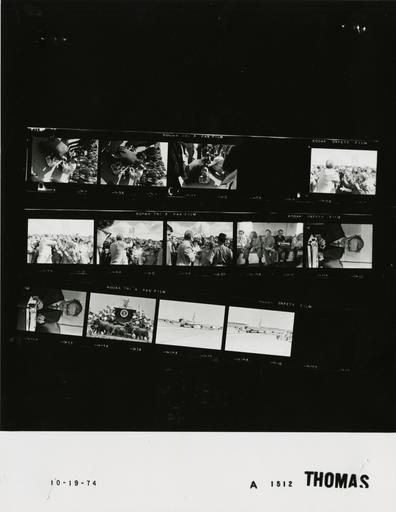 Keywords: Ford A1512 NLGRF photo contact sheet (1974-10-19)(Gerald Ford Library).jpg White House Photographic Office WHPO is housed at the Gerald R Ford Presidential Library a branch of the National Archives and Records Administration NARA <br/><br/> This file is a 200 dpi photo contact sheet having images from roll of film A1512 of the August 9 1974 - January 20 1977 Gerald R Ford White House Photographic Office Series A0001-A9999 and B0001-B2886 photographs <br/><br/> The date on the photo contact sheet is the date the roll of film was processed not necessarily the date the photographs were taken See table below for additional details 1974-10-19 Gerald R Ford Presidential Library Image http //www fordlibrarymuseum gov/library/whphotos/A1512_NLGRF jpg A1512_NLGRF jpg from http //www fordlibrarymuseum gov/library/whphotos/19741019whpo pdf White House Photographs October 19 1974 of the http //www fordlibrarymuseum gov/Library/whphotos/whpo asp White House Photographic Collection page White House Photographic Office WHPO - Thomas PD-USGov Institution Institution Gerald R Ford Presidential Library Table wikitable sortable + Photo contact sheet A1512 U S President Ford Administration Gerald R Ford Library Frame s Tone Subject proper Subject generic Names Geographic Location Photographer Date - 3-5 BW Following arrival for Campaign Trip to South Carolina - Greenville South Carolina Lukash and agent treating cadet who is lying on tarmac; others watchingl; shows us of a First Aid Trauma FAT kit Lukash Secret Service ROTC Cadet Others Greenville SC Greenville/Spart anburg Jet Airport - Tarmac Thomas 1974-10-19 - 6 BW Thomas 1974-10-19 - 7-10 BW Following arrival for Campaign Trip to South Carolina - Greenville South Carolina greeting handshaking mingling GRF Crowd Greenville SC Greenville/Spart anburg Jet Airport Thomas 1974-10-19 - 11 BW Flight to Rock Hill Mall Rock Hill South Carolina - Greenville South Carolina seated Media Greenville SC Press Helicopter Thomas 1974-10-19 - 12-13 BW Flight to Rock Hill Mall Rock Hill South Carolina - Greenville South Carolina seated typing One Unidentified Media Greenville SC Press Helicopter Thomas 1974-10-19 - 13 BW Republican Fundraising Luncheon - Greenville South Carolina speaking from podium - medium range herd of model elephants in front of podium GRF Greenville SC Greenville Memorial Auditorium Thomas 1974-10-19 - 14-15 BW Prior to Departure for Greensboro North Carolina - Greenville South Carolina Air Force One Greenville SC Greenville/Spart anburg Jet Airport - Tarmac Thomas 1974-10-19 Gerald R Ford Presidential Library and Museum-cooperation PD-USGov Contact sheets by the Ford White House October 1974 |