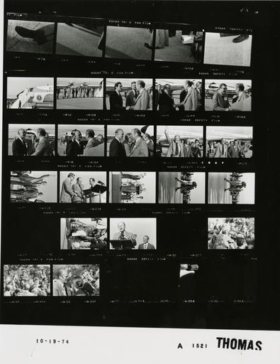 Keywords: Ford A1521 NLGRF photo contact sheet (1974-10-19)(Gerald Ford Library).jpg White House Photographic Office WHPO is housed at the Gerald R Ford Presidential Library a branch of the National Archives and Records Administration NARA <br/><br/> This file is a 200 dpi photo contact sheet having images from roll of film A1521 of the August 9 1974 - January 20 1977 Gerald R Ford White House Photographic Office Series A0001-A9999 and B0001-B2886 photographs <br/><br/> The date on the photo contact sheet is the date the roll of film was processed not necessarily the date the photographs were taken See table below for additional details 1974-10-19 Gerald R Ford Presidential Library Image http //www fordlibrarymuseum gov/library/whphotos/A1521_NLGRF jpg A1521_NLGRF jpg from http //www fordlibrarymuseum gov/library/whphotos/19741019whpo pdf White House Photographs October 19 1974 of the http //www fordlibrarymuseum gov/Library/whphotos/whpo asp White House Photographic Collection page White House Photographic Office WHPO - Thomas PD-USGov Institution Institution Gerald R Ford Presidential Library Table wikitable sortable + Photo contact sheet A1521 U S President Ford Administration Gerald R Ford Library Frame s Tone Subject proper Subject generic Names Geographic Location Photographer Date - 23 BW Arrival for Campaign Trip in South Carolina - Greenville South Carolina standing near podium GRF Platform Guests Greenville SC Greenville/Spart anburg Jet Airport Thomas 1974-10-19 - 24 BW Arrival for Campaign Trip in South Carolina; US Senator from South Carolina SC - Greenville South Carolina Thurmond speaking at podium; others standing in background GRF Sen Thurmond Platform Guests Greenville SC Greenville/Spart anburg Jet Airport Thomas 1974-10-19 - 25-26 BW Arrival for Campaign Trip in South Carolina - Greenville South Carolina operating film camera; crowd in background Television film cameraman Crowd Greenville SC Greenville/Spart anburg Jet Airport Thomas 1974-10-19 - 27 BW Thomas 1974-10-19 - 28 BW President's Personal Photographer -Greenville South Carolina kneeling taking photograph Kennerly Greenville SC Greenville/Spart anburg Jet Airport Thomas 1974-10-19 - 29 BW Arrival for Campaign Trip in South Carolina; US Senator from South Carolina SC - Greenville South Carolina GRF at podium speaking gesturing; Thurmond in background GRF Sen Thurmond Greenville SC Greenville/Spart anburg Jet Airport Thomas 1974-10-19 - 30 BW Thomas 1974-10-19 - 31-33 BW Arrival for Campaign Trip in South Carolina - Greenville South Carolina greeting handshaking mingling GRF Crowd Greenville SC Greenville/Spart anburg Jet Airport Thomas 1974-10-19 - 7-11 BW Thomas 1974-10-19 - 12 BW Arrival for Campaign Trip in South Carolina - Greenville South Carolina standing at top of steps to Air Force One waving GRF Greenville SC Greenville/Spart anburg Jet Airport Thomas 1974-10-19 - 13 BW Arrival for Campaign Trip in South Carolina - Greenville South Carolina greeting handshaking -Air Force One Marine One and backup helicopter in background GRF Welcoming Committee Greenville SC Greenville/Spart anburg Jet Airport Thomas 1974-10-19 - 14-16 BW Arrival for Campaign Trip in South Carolina - Greenville South Carolina greeting handshaking -Marine One copter in background GRF Welcoming Committee Greenville SC Greenville/Spart anburg Jet Airport Thomas 1974-10-19 - 17-19 BW Arrival for Campaign Trip in South Carolina; Former Army Chief of Staff -Greenville South Carolina greeting handshaking -Marine One copter in background GRF William Westmoreland Greenville SC Greenville/Spart anburg Jet Airport Thomas 1974-10-19 - 20-21 BW Arrival for Campaign Trip in South Carolina; US Senator from South Carolina SC - Greenville South Carolina walking waving - Air Force One in background GRF Sen Thurmond Greenville SC Greenville/Spart anburg Jet Airport Thomas 1974-10-19 - 22 BW Arrival for Campaign Trip in South Carolina; US Senator from South Carolina SC - Greenville South Carolina standing on platform GRF waving GRF Sen Thurmond Greenville SC Greenville/Spart anburg Jet Airport Thomas 1974-10-19 Gerald R Ford Presidential Library and Museum-cooperation PD-USGov Contact sheets by the Ford White House October 1974 |