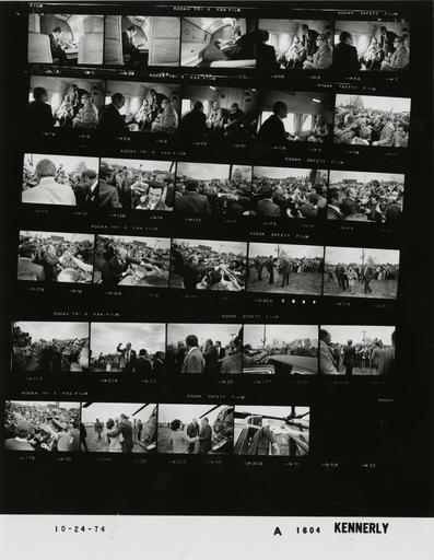 | Keywords: Ford A1604 NLGRF photo contact sheet (1974-10-24)(Gerald Ford Library).jpg  White House Photographic Office WHPO is housed at the Gerald R Ford Presidential Library a branch of the National Archives and Records Administration NARA <br/><br/> This file is a 200 dpi photo contact sheet having images from roll of film A1604 of the August 9 1974 - January 20 1977 Gerald R Ford White House Photographic Office Series A0001-A9999 and B0001-B2886 photographs <br/><br/> The date on the photo contact sheet is the date the roll of film was processed not necessarily the date the photographs were taken See table below for additional details 1974-10-24 Gerald R Ford Presidential Library Image http //www fordlibrarymuseum gov/library/whphotos/A1604_NLGRF jpg A1604_NLGRF jpg from http //www fordlibrarymuseum gov/library/whphotos/19741024whpo pdf White House Photographs October 24 1974 of the http //www fordlibrarymuseum gov/Library/whphotos/whpo asp White House Photographic Collection page White House Photographic Office WHPO <br/> Creator David Hume Kennerly PD-USGov Institution Institution Gerald R Ford Presidential Library Table wikitable sortable + Photo contact sheet A1604 U S President Ford Administration Gerald R Ford Library Frame s Tone Subject proper Subject generic Names Geographic Location Photographer Date - 2A-4A BW seated working; copter Rumsfeld Marine One Kennerly 1974-10-24 - 5A-8A BW Helicopter Flight from Chicago Illinois to Melvin Illinois; Widow of late Senator from Illinois Burch standing leaning towards GRF; others seated; copter GRF Burch Louella Dirksen Others Marine One Kennerly 1974-10-24 - 9A BW Helicopter Flight from Chicago Illinois to Melvin Illinois; Widow of late Senator from Illinois seated talking; copter GRF Burch Louella Dirksen Marine One Kennerly 1974-10-24 - 10A BW Helicopter Flight from Chicago Illinois to Melvin Illinois; Widow of late Senator from Illinois seated talking; copter GRF Louella Dirksen Marine One Kennerly 1974-10-24 - 11A-19A BW Arrival for Honor Les Arends Day ; United States Representative from Illinois IL -Melvin Illinois greeting mingling handshaking GRF Secret Service Crowd Melvin IL Melvin City Little League Park Kennerly 1974-10-24 - 20A-21A BW Arrival for Honor Les Arends Day ; United States Representative from Illinois IL -Melvin Illinois GRF and Arends talking to crowd turning to camera; crowd behind rope GRF Rep Mrs Arends; Secret Service Crowd Melvin IL Melvin City Little League Park Kennerly 1974-10-24 - 22A BW Arrival for Honor Les Arends Day ; United States Representative from Illinois IL -Melvin Illinois greeting handshaking; crowd behind rope GRF Secret Service Crowd Melvin IL Ford County Fairground Kennerly 1974-10-24 - 23A-24A BW Honor Les Arends Day ; United States Representative from Illinois IL - Melvin Illinois GRF waving handshaking GRF Secret Service Crowd Melvin IL Ford County Fairground Kennerly 1974-10-24 - 25A-26A BW Honor Les Arends Day ; United States Representative from Illinois IL - Melvin Illinois GRF speaking to protesters carrying variety of signs GRF Secret Service Protesters Melvin IL Ford County Fairground Kennerly 1974-10-24 - 27A BW Honor Les Arends Day ; United States Representative from Illinois IL - Melvin Illinois greeting handshaking; crowd behind rope GRF Secret Service Crowd Melvin IL Ford County Fairground Kennerly 1974-10-24 - 28A-29A BW Prior to Departure from Honor Les Arends Day ; United States Representative from Illinois IL -Melvin Illinois saying goodbye near Marine One; copter GRF Rep Mrs Arends Melvin IL Melvin City Little League Park Kennerly 1974-10-24 - 30A BW Prior to Departure from Honor Les Arends Day ; United States Representative from Illinois IL -Melvin Illinois entering Marine One -taken from low level; GRF's head missing; copter GRF Melvin IL Melvin City Little League Park Kennerly 1974-10-24 Gerald R Ford Presidential Library and Museum-cooperation PD-USGov Contact sheets by the Ford White House October 1974 Photographs by David Hume Kennerly from 1974 |
