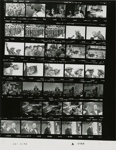 | Keywords: Ford A1703 NLGRF photo contact sheet (1974-10-31)(Gerald Ford Library).jpg White House Photographic Office WHPO is housed at the Gerald R Ford Presidential Library a branch of the National Archives and Records Administration NARA <br/><br/> This file is a 200 dpi photo contact sheet having images from roll of film A1703 of the August 9 1974 - January 20 1977 Gerald R Ford White House Photographic Office Series A0001-A9999 and B0001-B2886 photographs <br/><br/> The date on the photo contact sheet is the date the roll of film was processed not necessarily the date the photographs were taken See table below for additional details 1974-10-31 Gerald R Ford Presidential Library Image http //www fordlibrarymuseum gov/library/whphotos/A1703_NLGRF jpg A1703_NLGRF jpg from http //www fordlibrarymuseum gov/library/whphotos/19741031whpo pdf White House Photographs October 31 1974 of the http //www fordlibrarymuseum gov/Library/whphotos/whpo asp White House Photographic Collection page White House Photographic Office WHPO <br/> Creator David Hume Kennerly PD-USGov Institution Institution Gerald R Ford Presidential Library Table wikitable sortable + Photo contact sheet A1703 U S President Ford Administration Gerald R Ford Library Frame s Tone Subject proper Subject generic Names Geographic Location Photographer Date - 3A-4A BW California Republican Fundraising Dinner - Los Angeles California sitting down; all not in every frame GRF Ronald Nancy Reagan Others Los Angeles CA Century Plaza Hotel - Pacific Palisades Room Kennerly 1974-10-31 - 1A BW Awaiting Departure from Trip to Iowa -Sioux City Iowa standing behind rope Crowd Sioux City IA Sioux City Municipal Airport Kennerly 1974-10-31 - 2A BW Departure from Trip to Iowa - Sioux City Iowa close-up of backs Crowd Sioux City IA Sioux City Municipal Airport Kennerly 1974-10-31 - 5A BW Trip to California -Los Angeles California standing between beds; on telephone smoking pipe; in housecoat GRF Los Angeles CA Century Plaza Hotel - President's Suite Kennerly 1974-11-01 - 6A-8A BW Prior to Departure from Long Beach -Long Beach California handshaking thanking saying goodbye GRF Motorcycle Patrolmen Long Beach CA Long Beach Airport Kennerly 1974-11-01 - 9A-13A BW Arrival for Campaign Rally for Rep Mathias; Hat Gift from Dennis Prindiville Mayor Clovis California - Fresno California speaking at podium; holding wearing cowboy hat GRF Fresno CA Fresno Airport Kennerly 1974-11-01 - 14A-16A BW Arrival for Campaign Rally for Rep Mathias; United States Representative from California; Hat Gift from Dennis Prindiville Mayor Clovis California - Fresno California standing at podium waving wearing cowboy hats GRF Rep Mathias Fresno CA Fresno Airport Kennerly 1974-11-01 - 17A BW Arrival for Trip to Oregon - Portland Oregon greeting handshaking GRF Welcoming Committee Portland OR Portland International Airport Kennerly 1974-11-01 - 18A BW Arrival for Trip to Oregon - Portland Oregon greeting handshaking GRF Crowd Portland OR Portland International Airport Kennerly 1974-11-01 - 19A-20A BW Trip to Oregon - Portland Oregon standing on traffic light Unidentified Man Portland OR Portland International Airport Kennerly 1974-11-01 - 21A BW Prior to White House Conference on Domestic and Economic Affairs - Portland Oregon GRF standing; others standing applauding GRF Others Portland OR Portland Memorial Coliseum -Convention Hall Kennerly 1974-11-01 - 22A-23A BW White House Conference on Domestic and Economic Affairs - Portland Oregon Man introducing GRF others seated GRF Platform Participants Portland OR Portland Memorial Coliseum -Convention Hall Kennerly 1974-11-01 - 24A-25A BW White House Conference on Domestic and Economic Affairs - Portland Oregon GRF speaking at podium; taken from right of room GRF Platform Participants Crowd Portland OR Portland Memorial Coliseum -Convention Hall Kennerly 1974-11-01 - 26A-28A BW White House Conference on Domestic and Economic Affairs - Portland Oregon seated listening Women in Crowd Portland OR Portland Memorial Coliseum -Convention Hall Kennerly 1974-11-01 - 29A-31A BW Oregon Museum of Science and Industry 15th Annual Auction; United States Senator from Oregon OR - Portland Oregon standing Packwood applauding; formal wear GRF Sen Packwood Portland OR Portland Memorial Coliseum Kennerly 1974-11-01 - 32A-34A BW Oregon Museum of Science and Industry 15th Annual Auction; United States Senator from Oregon OR - Portland Oregon standing at microphone accepting applause; wearing tuxedo GRF Portland OR Portland Memorial Coliseum Kennerly 1974-11-01 Gerald R Ford Presidential Library and Museum-cooperation PD-USGov Contact sheets by the Ford White House October 1974 Photographs by David Hume Kennerly from 1974 |