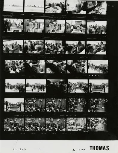 | Keywords: Ford A1744 NLGRF photo contact sheet (1974-11-02)(Gerald Ford Library).jpg White House Photographic Office WHPO is housed at the Gerald R Ford Presidential Library a branch of the National Archives and Records Administration NARA <br/><br/> This file is a 200 dpi photo contact sheet having images from roll of film A1744 of the August 9 1974 - January 20 1977 Gerald R Ford White House Photographic Office Series A0001-A9999 and B0001-B2886 photographs <br/><br/> The date on the photo contact sheet is the date the roll of film was processed not necessarily the date the photographs were taken See table below for additional details 1974-11-02 Gerald R Ford Presidential Library Image http //www fordlibrarymuseum gov/library/whphotos/A1744_NLGRF jpg A1744_NLGRF jpg from http //www fordlibrarymuseum gov/library/whphotos/19741102whpo pdf White House Photographs November 2 1974 of the http //www fordlibrarymuseum gov/Library/whphotos/whpo asp White House Photographic Collection page White House Photographic Office WHPO - Thomas PD-USGov Institution Institution Gerald R Ford Presidential Library Table wikitable sortable + Photo contact sheet A1744 U S President Ford Administration Gerald R Ford Library Frame s Tone Subject proper Subject generic Names Geographic Location Photographer Date - 2-3 BW Arrival for Campaign Rally for Mayor Garn -Salt Lake City Utah plane taxiing towards tarmac Air Force One Salt Lake City UT Utah International Airport Thomas 1974-11-02 - 4-10 BW Tour of Center - Salt Lake City Utah GRF watching students demonstrate skills GRF Students Faculty Salt Lake City UT Columbus Community Center -Workshop Room Thomas 1974-11-02 - 11-20 BW Tour of Center - Salt Lake City Utah greeting handshaking GRF Students Faculty Salt Lake City UT Columbus Community Center -Workshop Room Thomas 1974-11-02 - 21-23 BW Arrival for Campaign Rally for Mayor Garn; Candidate for United States Senate from Utah - Salt Lake City Utah walking waving handshaking GRF Mayor Garn Others Salt Lake City UT University of Utah Special Events Center -Outside Thomas 1974-11-02 - 24 BW Arrival for Campaign Rally for Mayor Garn; President University of Utah - Salt Lake City Utah greeting handshaking GRF David Gardner Others Salt Lake City UT University of Utah Special Events Center Thomas 1974-11-02 - 25-27 BW Return to Motorcade for Campaign Rally for Mayor Garn - Salt Lake City Utah walking waving handshaking; returning to motorcade to take tunnel under Center; Kennedy JFK Limousine GRF Mayor Garn Others Salt Lake City UT University of Utah Special Events Center - Outside Thomas 1974-11-02 - 28-34 BW Campaign Rally for Mayor Garn; Candidate for United States Senate from Utah -Salt Lake City Utah GRF and Garn standing waving on platform GRF Mayor Garn Platform Guests Others Salt Lake City UT University of Utah Special Events Center Thomas 1974-11-02 - 35 BW Campaign Rally for Mayor Garn; Candidate for United States Senate from Utah -Salt Lake City Utah Garn speaking at podium GRF Mayor Garn Platform Guests Others Salt Lake City UT University of Utah Special Events Center Thomas 1974-11-02 - 36 BW Campaign Rally for Mayor Garn; Candidate for United States Senate from Utah -Salt Lake City Utah GRF and Garn embracing near podium GRF Mayor Garn Platform Guests Others Salt Lake City UT University of Utah Special Events Center Thomas 1974-11-02 Gerald R Ford Presidential Library and Museum-cooperation PD-USGov Contact sheets by the Ford White House November 1974 |