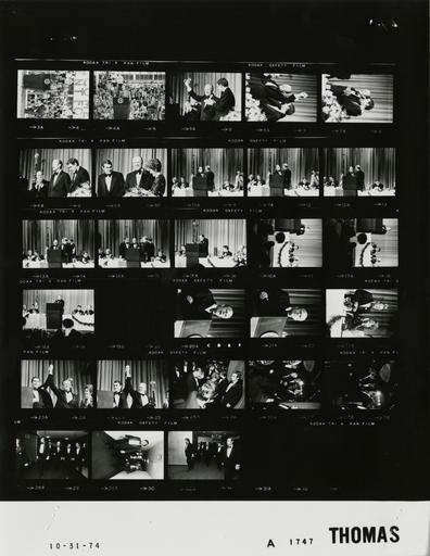 | Keywords: Ford A1747 NLGRF photo contact sheet (1974-10-31)(Gerald Ford Library).jpg White House Photographic Office WHPO is housed at the Gerald R Ford Presidential Library a branch of the National Archives and Records Administration NARA <br/><br/> This file is a 200 dpi photo contact sheet having images from roll of film A1747 of the August 9 1974 - January 20 1977 Gerald R Ford White House Photographic Office Series A0001-A9999 and B0001-B2886 photographs <br/><br/> The date on the photo contact sheet is the date the roll of film was processed not necessarily the date the photographs were taken See table below for additional details 1974-10-31 Gerald R Ford Presidential Library Image http //www fordlibrarymuseum gov/library/whphotos/A1747_NLGRF jpg A1747_NLGRF jpg from http //www fordlibrarymuseum gov/library/whphotos/19741031whpo pdf White House Photographs October 31 1974 of the http //www fordlibrarymuseum gov/Library/whphotos/whpo asp White House Photographic Collection page White House Photographic Office WHPO - Thomas PD-USGov Institution Institution Gerald R Ford Presidential Library Table wikitable sortable + Photo contact sheet A1747 U S President Ford Administration Gerald R Ford Library Frame s Tone Subject proper Subject generic Names Geographic Location Photographer Date - 4-5 BW Campaign Trip to Iowa; United States Representative from Iowa IA - Sioux City Iowa GRF at podium others seated GRF Rep Mrs Mayne Crowd Sioux City IA Sioux City Municipal Airport Thomas 1974-10-31 - 6-8 BW California Republican Fundraising Dinner; State Comptroller - Los Angeles California standing near podium arms raised; formal wear GRF Houston Flournoy Los Angeles CA Century Plaza Hotel - Los Angeles Ballroom Thomas 1974-10-31 - 9 BW California Republican Fundraising Dinner; Comedian State Comptroller - Los Angeles California standing near podium Hope applauding; formal wear GRF Bob Hope Houston Flournoy Los Angeles CA Century Plaza Hotel - Los Angeles Ballroom Thomas 1974-10-31 - 10 BW California Republican Fundraising Dinner; State Comptroller; First Lady of California - Los Angeles California standing near podium; formal wear GRF Houston Flournoy Nancy Reagan Los Angeles CA Century Plaza Hotel - Los Angeles Ballroom Thomas 1974-10-31 - 11-14 BW California Republican Fundraising Dinner; Comedian - Los Angeles California embracing near podium; formal wear GRF Bob Hope Los Angeles CA Century Plaza Hotel - Los Angeles Ballroom Thomas 1974-10-31 - 15 BW California Republican Fundraising Dinner; Comedian; Governor of California; State Comptroller - Los Angeles California standing near podium; formal wear GRF Bob Hope Houston Flournoy Gov Reagan Others Los Angeles CA Century Plaza Hotel - Los Angeles Ballroom Thomas 1974-10-31 - 16-19 BW California Republican Fundraising Dinner; Comedian; Governor of California; State Comptroller - Los Angeles California Hope at podium others seated; all not in every frame formal wear GRF Bob Hope Houston Flournoy Gov Reagan Others Los Angeles CA Century Plaza Hotel - Los Angeles Ballroom Thomas 1974-10-31 - 20 BW Thomas 1974-10-31 - 21-22 BW California Republican Fundraising Dinner - Los Angeles California speaking at podium; formal wear GRF Los Angeles CA Century Plaza Hotel - Los Angeles Ballroom Thomas 1974-10-31 - 23 BW California Republican Fundraising Dinner; First Lady of California -Los Angeles California standing Reagan applauding; formal wear GRF Nancy Reagan Los Angeles CA Century Plaza Hotel - Los Angeles Ballroom Thomas 1974-10-31 - 24-25 BW California Republican Fundraising Dinner; State Comptroller; First Lady of California - Los Angeles California GRF and Flournoy arms raised Reagan applauding; formal wear GRF Houston Flournoy Nancy Reagan Los Angeles CA Century Plaza Hotel - Los Angeles Ballroom Thomas 1974-10-31 - 26-28 BW Following California Republican Fundraising Dinner; Governor and First Lady of California - Los Angeles California walking out of room talking; all not in every frame formal wear GRF Gov Mrs Reagan Others Los Angeles CA Century Plaza Hotel - Los Angeles Ballroom Thomas 1974-10-31 - 29-31 BW Following California Republican Fundraising Dinner -Los Angeles California walking towards President's Suite; formal wear GRF O'Donnell Secret Service Los Angeles CA Century Plaza Hotel - Hallway Thomas 1974-10-31 Gerald R Ford Presidential Library and Museum-cooperation PD-USGov Contact sheets by the Ford White House October 1974 Century Plaza Hotel |