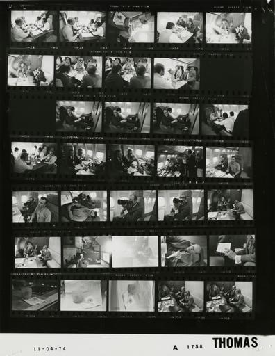 Keywords: Ford A1758 NLGRF photo contact sheet (1974-11-02)(Gerald Ford Library).jpg White House Photographic Office WHPO is housed at the Gerald R Ford Presidential Library a branch of the National Archives and Records Administration NARA <br/><br/> This file is a 200 dpi photo contact sheet having images from roll of film A1758 of the August 9 1974 - January 20 1977 Gerald R Ford White House Photographic Office Series A0001-A9999 and B0001-B2886 photographs <br/><br/> The date on the photo contact sheet is the date the roll of film was processed not necessarily the date the photographs were taken See table below for additional details 1974-11-02 Gerald R Ford Presidential Library Image http //www fordlibrarymuseum gov/library/whphotos/A1758_NLGRF jpg A1758_NLGRF jpg from http //www fordlibrarymuseum gov/library/whphotos/19741102whpo pdf White House Photographs November 2 1974 of the http //www fordlibrarymuseum gov/Library/whphotos/whpo asp White House Photographic Collection page White House Photographic Office WHPO - Thomas PD-USGov Institution Institution Gerald R Ford Presidential Library Table wikitable sortable + Photo contact sheet A1758 U S President Ford Administration Gerald R Ford Library Frame s Tone Subject proper Subject generic Names Geographic Location Photographer Date - 31A BW Flight from Wichita Kansas to Andrews Air Force Base Hartmann's hand holding menu Hartmann Air Force One - President's Cabin Thomas 1974-11-02 - 2A-3A BW Flight from Wichita Kansas to Andrews Air Force Base seated at table talking Keiser Three Secret Service Air Force One Thomas 1974-11-02 - 4A BW Flight from Wichita Kansas to Andrews Air Force Base seated at table under blanket Lukash Air Force One Thomas 1974-11-02 - 5A BW Flight from Wichita Kansas to Andrews Air Force Base seated at table talking Korologos Burch Nessen Air Force One Thomas 1974-11-02 - 6A-7A BW Flight from Wichita Kansas to Andrews Air Force Base seated talking GRF Cheney Air Force One - President's Cabin Thomas 1974-11-02 - 8A-9A BW Flight from Wichita Kansas to Andrews Air Force Base seated at table talking; only Korologos facing camera Korologos Burch Nessen Air Force One Thomas 1974-11-02 - 10A BW Flight from Wichita Kansas to Andrews Air Force Base seated at table talking Rustand Cavaney O'Donnell Air Force One Thomas 1974-11-02 - 11A-12A BW Thomas 1974-11-02 - 13A-15A BW Flight from Wichita Kansas to Andrews Air Force Base seated talking Orben Gwen Anderson Air Force One Thomas 1974-11-02 - 16A BW Flight from Wichita Kansas to Andrews Air Force Base seated at table talking; Keiser on telephone Keiser Three Secret Service Air Force One Thomas 1974-11-02 - 17A-19A BW Flight from Wichita Kansas to Andrews Air Force Base seated talking; all not in every frame Secret Service Media Air Force One Thomas 1974-11-02 - 20A BW Flight from Wichita Kansas to Andrews Air Force Base -UPI Correspondent Nessen standing others seated; talking Nessen Dick Growald Media Air Force One Thomas 1974-11-02 - 21A-23A BW Flight from Wichita Kansas to Andrews Air Force Base seated; Burch holding camera with telephoto lens Burch Sardo Air Force One Thomas 1974-11-02 - 24A-25A BW Flight from Wichita Kansas to Andrews Air Force Base seated; holding camera with telephoto lens Burch Air Force One Thomas 1974-11-02 - 26A-29A BW Flight from Wichita Kansas to Andrews Air Force Base GRF seated at table Hartmann on sofa; talking; GRF smoking pipe GRF Hartmann Air Force One - President's Cabin Thomas 1974-11-02 - 30A BW Flight from Wichita Kansas to Andrews Air Force Base seated at table reading document GRF Air Force One - President's Cabin Thomas 1974-11-02 - 32A-34A BW Flight from Wichita Kansas to Andrews Air Force Base Drink Glass and Air Force One napkin Air Force One - President's Cabin Thomas 1974-11-02 - 35A-36A BW Flight from Wichita Kansas to Andrews Air Force Base GRF seated at table others on sofa; talking GRF Orben Hartmann Air Force One - President's Cabin Thomas 1974-11-02 Gerald R Ford Presidential Library and Museum-cooperation PD-USGov Contact sheets by the Ford White House November 1974 |