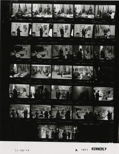 | Keywords: Ford A1811 NLGRF photo contact sheet (1974-11-06)(Gerald Ford Library).jpg White House Photographic Office WHPO is housed at the Gerald R Ford Presidential Library a branch of the National Archives and Records Administration NARA <br/><br/> This file is a 200 dpi photo contact sheet having images from roll of film A1811 of the August 9 1974 - January 20 1977 Gerald R Ford White House Photographic Office Series A0001-A9999 and B0001-B2886 photographs <br/><br/> The date on the photo contact sheet is the date the roll of film was processed not necessarily the date the photographs were taken See table below for additional details 1974-11-06 Gerald R Ford Presidential Library Image http //www fordlibrarymuseum gov/library/whphotos/A1811_NLGRF jpg A1811_NLGRF jpg from http //www fordlibrarymuseum gov/library/whphotos/19741106whpo pdf White House Photographs November 6 1974 of the http //www fordlibrarymuseum gov/Library/whphotos/whpo asp White House Photographic Collection page White House Photographic Office WHPO <br/> Creator David Hume Kennerly PD-USGov Institution Institution Gerald R Ford Presidential Library Table wikitable sortable + Photo contact sheet A1811 U S President Ford Administration Gerald R Ford Library Frame s Tone Subject proper Subject generic Names Geographic Location Photographer Date - 2A-5A BW Friend of Kennerly Young seated GRF standing behind desk; Hartmann and Unidentified Man not in every frame in background GRF Patti Young Hartmann Unidentified Man Oval Office Kennerly 1974-11-06 - 6A BW walking GRF gesturing GRF O'Donnell Betty Ford Oval Office Kennerly 1974-11-06 - 7A-16A BW Singer Honorary Chairman 1974 Christmas Seal Program greeting handshaking standing talking GRF Vicki Carr Oval Office Kennerly 1974-11-06 - 17A BW Singer Honorary Chairman 1974 Christmas Seal Program seated around desk talking GRF Vicki Carr Oval Office Kennerly 1974-11-06 - 18A-19A BW Opening of 1974 Christmas Seals Program - Singer Honorary Chairman 1974 Christmas Seal Program walking across lawn GRF Vicki Carr Rose Garden Kennerly 1974-11-06 - 20A BW Opening of 1974 Christmas Seals Program - Singer Honorary Chairman 1974 Christmas Seal Program standing talking near large poster-sized display of Christmas Seals; media in foreground GRF Vicki Carr Media Rose Garden Kennerly 1974-11-06 - 21A-22A BW Singer Honorary Chairman 1974 Christmas Seal Program standing talking GRF Vicki Carr Oval Office Kennerly 1974-11-06 - 23A BW standing talking; GRF putting on glasses GRF Rumsfeld Burch Scheduling and Advance Office Kennerly 1974-11-06 - 24A BW Prior to Presidential Tour of Old Executive Office Building walking toward OEOB -West Wing in background GRF O'Donnell Linder Secret Service Sidewalk Between Old Executive Office Building OEOB and White House Kennerly 1974-11-06 - 25A BW Presidential Tour of Old Executive Office Building walking down steps GRF O'Donnell Rumsfeld Linder Secret Service Old Executive Office Building OEOB -Stairwell Kennerly 1974-11-06 - 26A-33A BW Presidential Tour of Old Executive Office Building greeting talking - all not in every frame GRF Linder Rumsfeld Ruth Krell Ruth Henry Helen White Dorothy Spicer Sarah Young Mary Lindsay Beulah Baker Betty Fraser Mary Burns Old Executive Office Building OEOB -Telephone Room Kennerly 1974-11-06 Gerald R Ford Presidential Library and Museum-cooperation PD-USGov Contact sheets by the Ford White House November 1974 Photographs by David Hume Kennerly from 1974 |