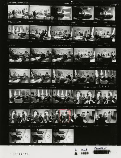 | Keywords: Ford A1823 NLGRF photo contact sheet (1974-11-08)(Gerald Ford Library).jpg White House Photographic Office WHPO is housed at the Gerald R Ford Presidential Library a branch of the National Archives and Records Administration NARA <br/><br/> This file is a 200 dpi photo contact sheet having images from roll of film A1823 of the August 9 1974 - January 20 1977 Gerald R Ford White House Photographic Office Series A0001-A9999 and B0001-B2886 photographs <br/><br/> The date on the photo contact sheet is the date the roll of film was processed not necessarily the date the photographs were taken See table below for additional details 1974-11-08 Gerald R Ford Presidential Library Image http //www fordlibrarymuseum gov/library/whphotos/A1823_NLGRF jpg A1823_NLGRF jpg from http //www fordlibrarymuseum gov/library/whphotos/19741108whpo pdf White House Photographs November 8 1974 of the http //www fordlibrarymuseum gov/Library/whphotos/whpo asp White House Photographic Collection page White House Photographic Office WHPO <br/> Creator David Hume Kennerly PD-USGov Institution Institution Gerald R Ford Presidential Library Table wikitable sortable + Photo contact sheet A1823 U S President Ford Administration Gerald R Ford Library Frame s Tone Subject proper Subject generic Names Geographic Location Photographer Date - 2-3 BW GRF seated at desk others leaning over desk; O'Donnell in background GRF Marsh Nessen Rumsfeld O'Donnell unidentified man Oval Office Kennerly 1974-11-08 - 4-6 BW GRF seated at desk others in foreground; Marsh's head missing GRF Nessen Marsh Oval Office Kennerly 1974-11-08 - 7-10 BW GRF seated at desk Rumsfeld standing talking; Marsh in frame 7 GRF Rumsfeld; Marsh Oval Office Kennerly 1974-11-08 - 11-14 BW seated around desk - various angles GRF Rumsfeld Marsh Oval Office Kennerly 1974-11-08 - 15-24 BW seated around desk - various angles GRF Rumsfeld Marsh Friedersdorf Oval Office Kennerly 1974-11-08 - 25-34 BW standing talking; Cheney leaning on back of chair - various angles Nessen Cheney Rumsfeld Scheduling and Advance Office Kennerly 1974-11-08 Gerald R Ford Presidential Library and Museum-cooperation PD-USGov Contact sheets by the Ford White House November 1974 Photographs by David Hume Kennerly from 1974 |