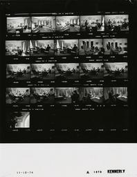 | Keywords: Ford A1878 NLGRF photo contact sheet (1974-11-12)(Gerald Ford Library).jpg White House Photographic Office WHPO is housed at the Gerald R Ford Presidential Library a branch of the National Archives and Records Administration NARA <br/><br/> This file is a 200 dpi photo contact sheet having images from roll of film A1878 of the August 9 1974 - January 20 1977 Gerald R Ford White House Photographic Office Series A0001-A9999 and B0001-B2886 photographs <br/><br/> The date on the photo contact sheet is the date the roll of film was processed not necessarily the date the photographs were taken See table below for additional details 1974-11-12 Gerald R Ford Presidential Library Image http //www fordlibrarymuseum gov/library/whphotos/A1878_NLGRF jpg A1878_NLGRF jpg from http //www fordlibrarymuseum gov/library/whphotos/19741112whpo pdf White House Photographs November 12 1974 of the http //www fordlibrarymuseum gov/Library/whphotos/whpo asp White House Photographic Collection page White House Photographic Office WHPO <br/> Creator David Hume Kennerly PD-USGov Institution Institution Gerald R Ford Presidential Library Table wikitable sortable + Photo contact sheet A1878 U S President Ford Administration Gerald R Ford Library Frame s Tone Subject proper Subject generic Names Geographic Location Photographer Date - 2A-4A BW seated at desk - long shots various angles GRF Oval Office Kennerly 1974-11-12 - 5A-6A BW seated around desk; Steward serving coffee GRF Kissinger Scowcroft White House Steward Oval Office Kennerly 1974-11-12 - 7A BW seated around desk - long shot GRF Kissinger Oval Office Kennerly 1974-11-12 - 8A-9A BW seated around desk GRF Kissinger Scowcroft Oval Office Kennerly 1974-11-12 - 10A-11A BW White House Communications Agency WHCA working with tape recorders WHCA Technicians Scheduling and Advance Office Kennerly 1974-11-12 - 12A-18A BW Consultant date may not be correct seated around desk talking GRF Bill Walker Robert Orr Oval Office Kennerly 1974-11-12 - 19A BW Black Star Photographer GRF standing near desk; Ward taking photographs - long shot GRF Fred Ward Oval Office Kennerly 1974-11-12 - 20A-22A BW GRF seated at desk; O'Donnell handing GRF documents GRF O'Donnell Oval Office Kennerly 1974-11-12 Gerald R Ford Presidential Library and Museum-cooperation PD-USGov Contact sheets by the Ford White House November 1974 Photographs by David Hume Kennerly from 1974 |