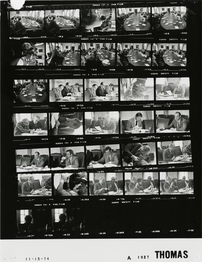 Keywords: Ford A1927 NLGRF photo contact sheet (1974-11-15)(Gerald Ford Library).jpg White House Photographic Office WHPO is housed at the Gerald R Ford Presidential Library a branch of the National Archives and Records Administration NARA <br/><br/> This file is a 200 dpi photo contact sheet having images from roll of film A1927 of the August 9 1974 - January 20 1977 Gerald R Ford White House Photographic Office Series A0001-A9999 and B0001-B2886 photographs <br/><br/> The date on the photo contact sheet is the date the roll of film was processed not necessarily the date the photographs were taken See table below for additional details 1974-11-15 Gerald R Ford Presidential Library Image http //www fordlibrarymuseum gov/library/whphotos/A1927_NLGRF jpg A1927_NLGRF jpg from http //www fordlibrarymuseum gov/library/whphotos/19741115whpo pdf White House Photographs November 15 1974 of the http //www fordlibrarymuseum gov/Library/whphotos/whpo asp White House Photographic Collection page White House Photographic Office WHPO - Thomas PD-USGov Institution Institution Gerald R Ford Presidential Library Table wikitable sortable + Photo contact sheet A1927 U S President Ford Administration Gerald R Ford Library Frame s Tone Subject proper Subject generic Names Geographic Location Photographer Date - 16 BW Legislative Message Review seated looking at documents smoking pipes GRF Seidman Cabinet Room Thomas 1974-11-15 - 17 BW Legislative Message Review seated looking at documents Marsh Theis Cabinet Room Thomas 1974-11-15 - 18 BW Legislative Message Review seated looking at documents headed propped in right hand Timmons Cabinet Room Thomas 1974-11-15 - 19 BW Legislative Message Review seated looking at documents; GRF smoking pipe GRF Seidman Cabinet Room Thomas 1974-11-15 - 20 BW Legislative Message Review seated looking at documents Raoul-Duval Cabinet Room Thomas 1974-11-15 - 21-22 BW Legislative Message Review seated looking at documents Unidentified Man Cabinet Room Thomas 1974-11-15 - 23-24 BW Legislative Message Review seated looking at documents; drinking coffee in first frame O'Neill Cabinet Room Thomas 1974-11-15 - 25-27 BW Legislative Message Review seated looking at documents smoking pipe GRF Cabinet Room Thomas 1974-11-15 - 28 BW Legislative Message Review seated looking at documents O'Neill Cabinet Room Thomas 1974-11-15 - 29-31 BW Legislative Message Review GRF seated looking at documents smoking pipe; Marsh seated in background GRF Marsh Cabinet Room Thomas 1974-11-15 - 2-12 BW Legislative Message Review seated around table - Various directions - all not in every frame GRF Seidman Ash O'Neill Cavanaugh Theis Timmons Raoul-Duval Nessen Others Cabinet Room Thomas 1974-11-15 - 13-14 BW Legislative Message Review seated at table taking notes Unidentified Man Ash O'Neill Cabinet Room Thomas 1974-11-15 - 15 BW Legislative Message Review seated looking at documents smoking pipe GRF Cabinet Room Thomas 1974-11-15 - 32-33 BW Legislative Message Review seated looking at documents GRF Cabinet Room Thomas 1974-11-15 Gerald R Ford Presidential Library and Museum-cooperation PD-USGov Contact sheets by the Ford White House November 1974 |
