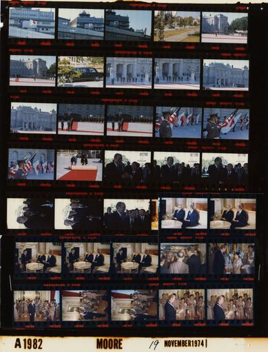 Keywords: Ford A1982 NLGRF photo contact sheet (1974-11-18)(Gerald Ford Library).jpg White House Photographic Office WHPO is housed at the Gerald R Ford Presidential Library a branch of the National Archives and Records Administration NARA <br/><br/> This file is a 200 dpi photo contact sheet having images from roll of film A1982 of the August 9 1974 - January 20 1977 Gerald R Ford White House Photographic Office Series A0001-A9999 and B0001-B2886 photographs <br/><br/> The date on the photo contact sheet is the date the roll of film was processed not necessarily the date the photographs were taken See table below for additional details 1974-11-18 Gerald R Ford Presidential Library Image http //www fordlibrarymuseum gov/library/whphotos/A1982_NLGRF jpg A1982_NLGRF jpg from http //www fordlibrarymuseum gov/library/whphotos/19741118whpo pdf White House Photographs November 18 1974 of the http //www fordlibrarymuseum gov/Library/whphotos/whpo asp White House Photographic Collection page White House Photographic Office WHPO - Moore PD-USGov Institution Institution Gerald R Ford Presidential Library Table wikitable sortable + Photo contact sheet A1982 U S President Ford Administration Gerald R Ford Library Frame s Tone Subject proper Subject generic Names Geographic Location Photographer Date - 2-4 Color Trip to Japan - 1st Visit to Japan by Sitting U S President - Local Time Control Tower and Terminal Tokyo Japan Tokyo International Airport Moore 1974-11-18 - 5 Color Trip to Japan - 1st Visit to Japan by Sitting U S President - Local Time Car entering Palace grounds - long shot Tokyo Japan Akasaka Palace - Entrance Drive Moore 1974-11-18 - 6-7 Color Trip to Japan - 1st Visit to Japan by Sitting U S President - Prior to Arrival Ceremony - Local Time marching into position - long shots Honor Guard Color Guard Military Band Tokyo Japan Akasaka Palace - Outside Moore 1974-11-19 - 8 Color Trip to Japan - 1st Visit to Japan by Sitting U S President - Arrival of Emperor Hirohito Prior to Arrival Ceremony - Local Time Limousine entering Palace grounds - long shot Tokyo Japan Akasaka Palace - Entrance Drive Moore 1974-11-19 - 9-12 Color Trip to Japan - 1st Visit to Japan by Sitting U S President - Arrival Ceremony -Emperor of Japan - Local Time standing for anthems - morning coats; formal wear; long shots GRF Hirohito Japanese Officials Tokyo Japan Akasaka Palace - Outside Moore 1974-11-19 - 13-14 Color Trip to Japan - 1st Visit to Japan by Sitting U S President - Arrival Ceremony -U S Ambassador to Japan; Chief of Protocol - Local Time standing on platform in center of courtyard; looking towards Honor Guard - long shots; formal wear GRF Amb James Hodgson Amb Hiroshi Ushida Tokyo Japan Akasaka Palace - Outside Moore 1974-11-19 - 15-17 Color Trip to Japan - 1st Visit to Japan by Sitting U S President - Arrival Ceremony - Local Time standing near palace; holding alternating American and Japanese flags Military Tokyo Japan Akasaka Palace - Outside Moore 1974-11-19 - 18 Color Trip to Japan - 1st Visit to Japan by Sitting U S President - Following Arrival Ceremony - Local Time rolling up red carpets Maintenance Crew Tokyo Japan Akasaka Palace - Outside Moore 1974-11-19 - 19-24 Color Trip to Japan - 1st Visit to Japan by Sitting U S President - Prior to Face to Face Meeting with Japanese Prime Minister - Local Time greeting handshaking talking GRF Kakuei Tanaka Tokyo Japan Prime Minister's Residence - Outside Moore 1974-11-19 - 25-29 Color Trip to Japan - 1st Visit to Japan by Sitting U S President - Governor of Tokyo - Local Time seated talking near fireplace GRF Gov Minobe Translator Tokyo Japan Akasaka Palace - Second Floor Salon Moore 1974-11-19 - 30 Color Trip to Japan - 1st Visit to Japan by Sitting U S President - Local Time standing talking - backs to camera GRF Others Tokyo Japan Akasaka Palace Moore 1974-11-19 - 31-36 Color Trip to Japan - 1st Visit to Japan by Sitting U S President - Presentation of Award by Japanese Boy Scouts - Local Time GRF wearing neckerchief; holding framed gift - all not in every frame GRF Boy Scouts Tokyo Japan Akasaka Palace - Cocktail Lounge Moore 1974-11-19 Gerald R Ford Presidential Library and Museum-cooperation PD-USGov Contact sheets by the Ford White House November 1974 |