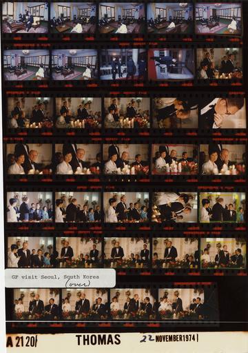 Keywords: Ford A2120 NLGRF photo contact sheet (1974-11-22)(Gerald Ford Library).jpg White House Photographic Office WHPO is housed at the Gerald R Ford Presidential Library a branch of the National Archives and Records Administration NARA <br/><br/> This file is a 200 dpi photo contact sheet having images from roll of film A2120 of the August 9 1974 - January 20 1977 Gerald R Ford White House Photographic Office Series A0001-A9999 and B0001-B2886 photographs <br/><br/> The date on the photo contact sheet is the date the roll of film was processed not necessarily the date the photographs were taken See table below for additional details 1974-11-22 Gerald R Ford Presidential Library Image http //www fordlibrarymuseum gov/library/whphotos/A2120_NLGRF jpg A2120_NLGRF jpg from http //www fordlibrarymuseum gov/library/whphotos/19741122whpo pdf White House Photographs November 22 1974 of the http //www fordlibrarymuseum gov/Library/whphotos/whpo asp White House Photographic Collection page White House Photographic Office WHPO - Thomas PD-USGov Institution Institution Gerald R Ford Presidential Library Table wikitable sortable + Photo contact sheet A2120 U S President Ford Administration Gerald R Ford Library Frame s Tone Subject proper Subject generic Names Geographic Location Photographer Date - 19-20 Color Trip to the Republic of Korea - State Dinner Hosted by President - Daughter of President - Local Time seated listening; formal wear GRF Park Hun Hae Seoul South Korea Capitol Building -Banquet Hall Thomas 1974-11-22 - 21-22 Color Trip to the Republic of Korea - State Dinner Hosted by President - Daughter of President - Local Time seated at head table; formal wear GRF President Park Chung Hee Park Hun Hae Seoul South Korea Capitol Building -Banquet Hall Thomas 1974-11-22 - 23 Color Trip to the Republic of Korea - State Dinner Hosted by President - Daughter of President - Local Time seated at head table; formal wear GRF Park Hun Hae Seoul South Korea Capitol Building -Banquet Hall Thomas 1974-11-22 - 24-29 Color Trip to the Republic of Korea - State Dinner Hosted by President - Daughter of President - Local Time standing raising glasses for toast; formal wear GRF President Park Chung Hee Park Hun Hae Others Seoul South Korea Capitol Building -Banquet Hall Thomas 1974-11-22 - 30-31 Color Trip to the Republic of Korea - State Dinner Hosted by President - Local Time GRF standing making remarks; others seated; formal wear GRF President Park Chung Hee Others Seoul South Korea Capitol Building -Banquet Hall Thomas 1974-11-22 - 32 Color Trip to the Republic of Korea - State Dinner Hosted by President - Daughter of President - Local Time GRF standing making remarks; others seated; formal wear GRF President Park Chung Hee Park Hun Hae Others Seoul South Korea Capitol Building -Banquet Hall Thomas 1974-11-22 - 33-37 Color Trip to the Republic of Korea - State Dinner Hosted by President - Daughter of President - Local Time standing raising glasses for toast; formal wear GRF President Park Chung Hee Park Hun Hae Others Seoul South Korea Capitol Building -Banquet Hall Thomas 1974-11-22 - 4 Color Trip to the Republic of Korea - Prior to State Dinner Hosted by President - Local Time seated talking; formal wear GRF President Park Chung Hee Seoul South Korea Capitol Building -Holding Room Thomas 1974-11-22 - 5-10 Color Trip to the Republic of Korea - Prior to State Dinner Hosted by President - Daughter of President - Local Time seated talking - various distances; formal wear GRF President Park Chung Hee Park Hun Hae Kissinger Others Seoul South Korea Capitol Building -Holding Room Thomas 1974-11-22 - 11-12 Color Trip to the Republic of Korea - Prior to State Dinner Hosted by President - Local Time standing talking - all not in every frame; formal wear O'Donnell Others Seoul South Korea Capitol Building Thomas 1974-11-22 - 13-16 Color Trip to the Republic of Korea - State Dinner Hosted by President - Daughter of President - Local Time President Park standing making remarks; others seated; formal wear GRF President Park Chung Hee Park Hun Hae Others Seoul South Korea Capitol Building -Banquet Hall Thomas 1974-11-22 - 17 Color Trip to the Republic of Korea - State Dinner Hosted by President - Daughter of President - Local Time seated listening; formal wear GRF Park Hun Hae Seoul South Korea Capitol Building -Banquet Hall Thomas 1974-11-22 - 18 Color Trip to the Republic of Korea - State Dinner Hosted by President - Local Time seated listening -hand on chin; close up; formal wear Kissinger Seoul South Korea Capitol Building -Banquet Hall Thomas 1974-11-22 Gerald R Ford Presidential Library and Museum-cooperation PD-USGov Contact sheets by the Ford White House November 1974 |